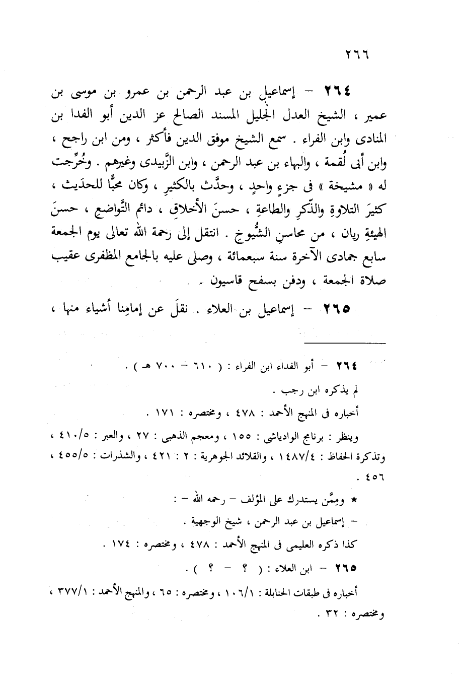 264 - إِسْمَاعِيل بن عبد الرَّحْمَن بن عَمْرو بن مُوسَى بن عُمَيْر الشَّيْخ الْعدْل الْجَلِيل الْمسند الصَّالح عز الدّين أَبُو الفدا بن المنادى وَابْن الْفراء