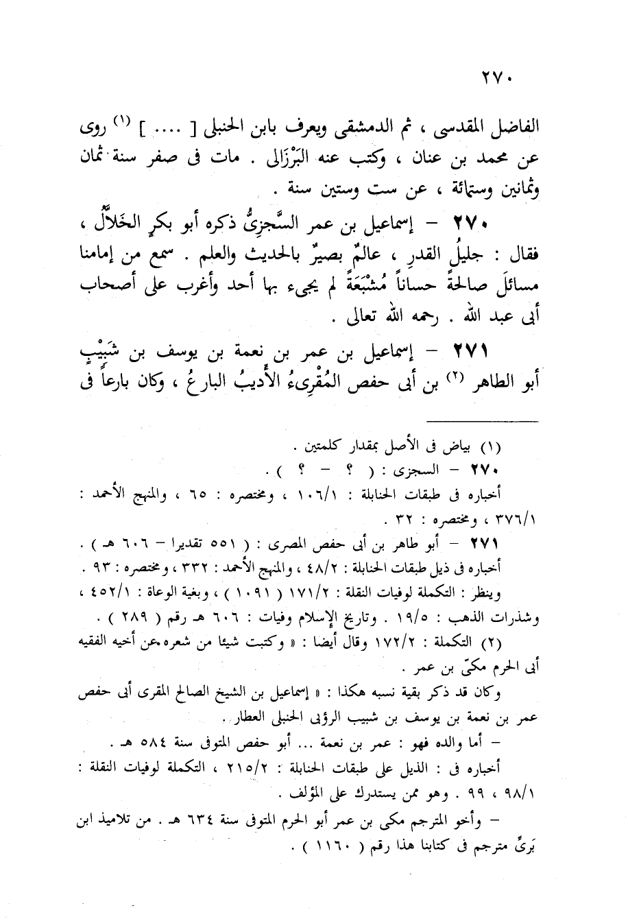 270 - إِسْمَاعِيل بن عمر السجزى ذكره أَبُو بكر الْخلال فَقَالَ جليل الْقدر عَالم بَصِير بِالْحَدِيثِ وَالْعلم