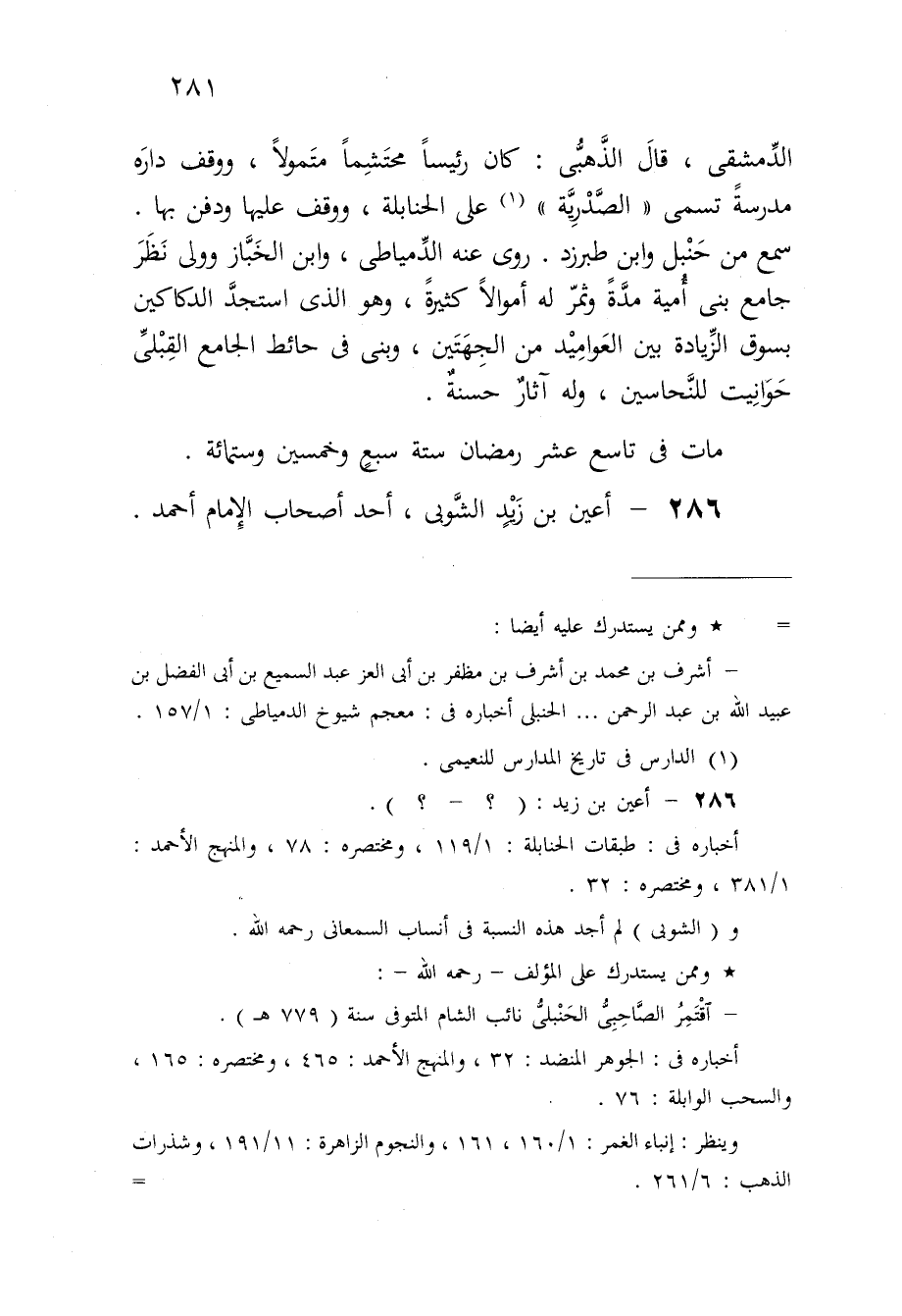 الدمشقى قَالَ الذهبى كَانَ رَئِيسا محتشما متمولا ووقف دَاره مدرسة تسمى الصدرية على الْحَنَابِلَة ووقف عَلَيْهَا وَدفن بهَا سمع من حَنْبَل وَابْن طبرزد