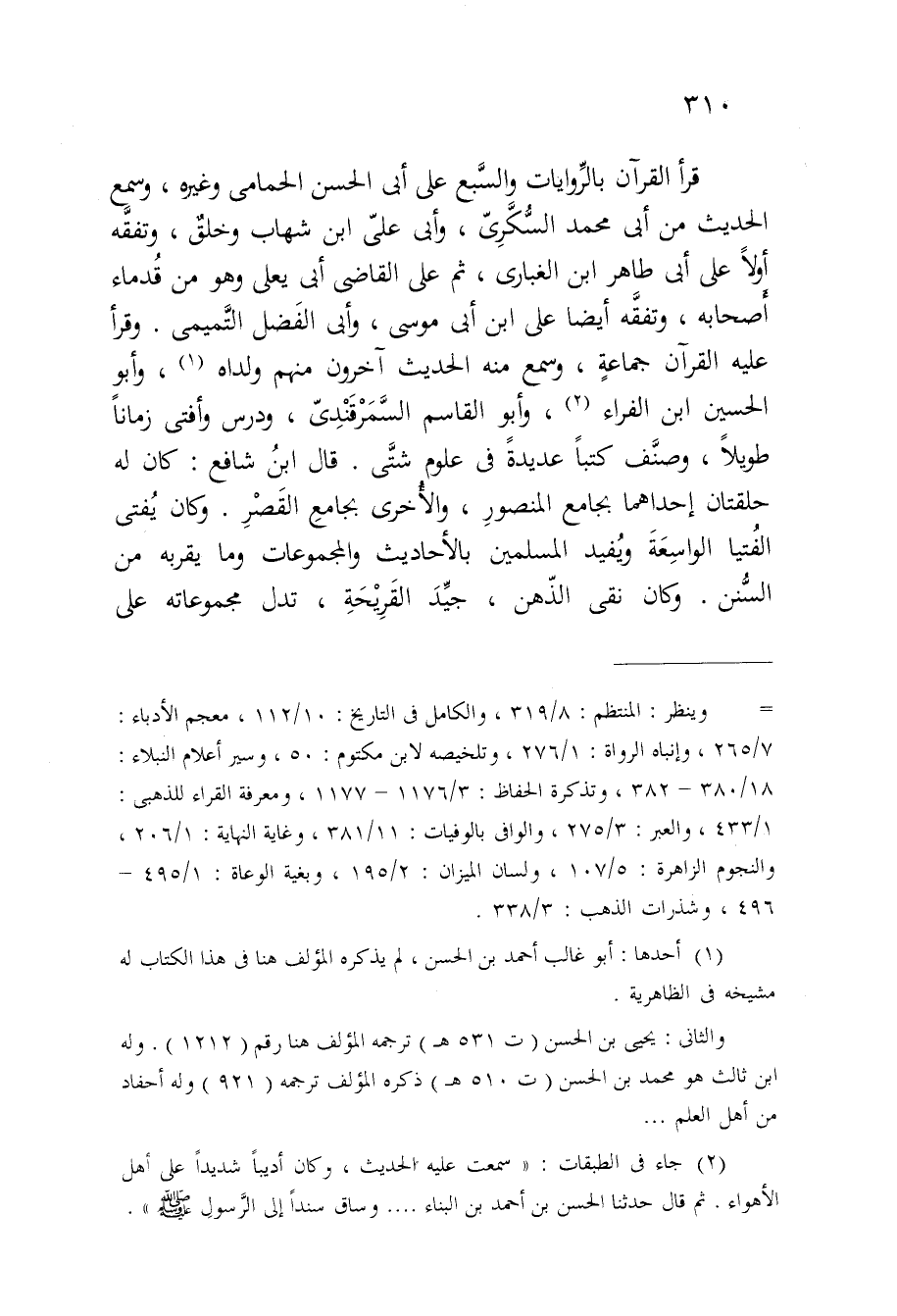 قَرَأَ الْقُرْآن بالروايات والسبع على أَبى الْحسن الحمامى وَغَيره وَسمع الحَدِيث من أَبى مُحَمَّد السكرى وأبى على ابْن شهَاب وَخلق وتفقه أَولا على أَبى طَاهِر ابْن الغبارى ثمَّ على القاضى إِلَى يعلى وَهُوَ من قدماء أَصْحَابه وتفقه أَيْضا على ابْن أَبى مُوسَى وأبى الْفضل التميمى