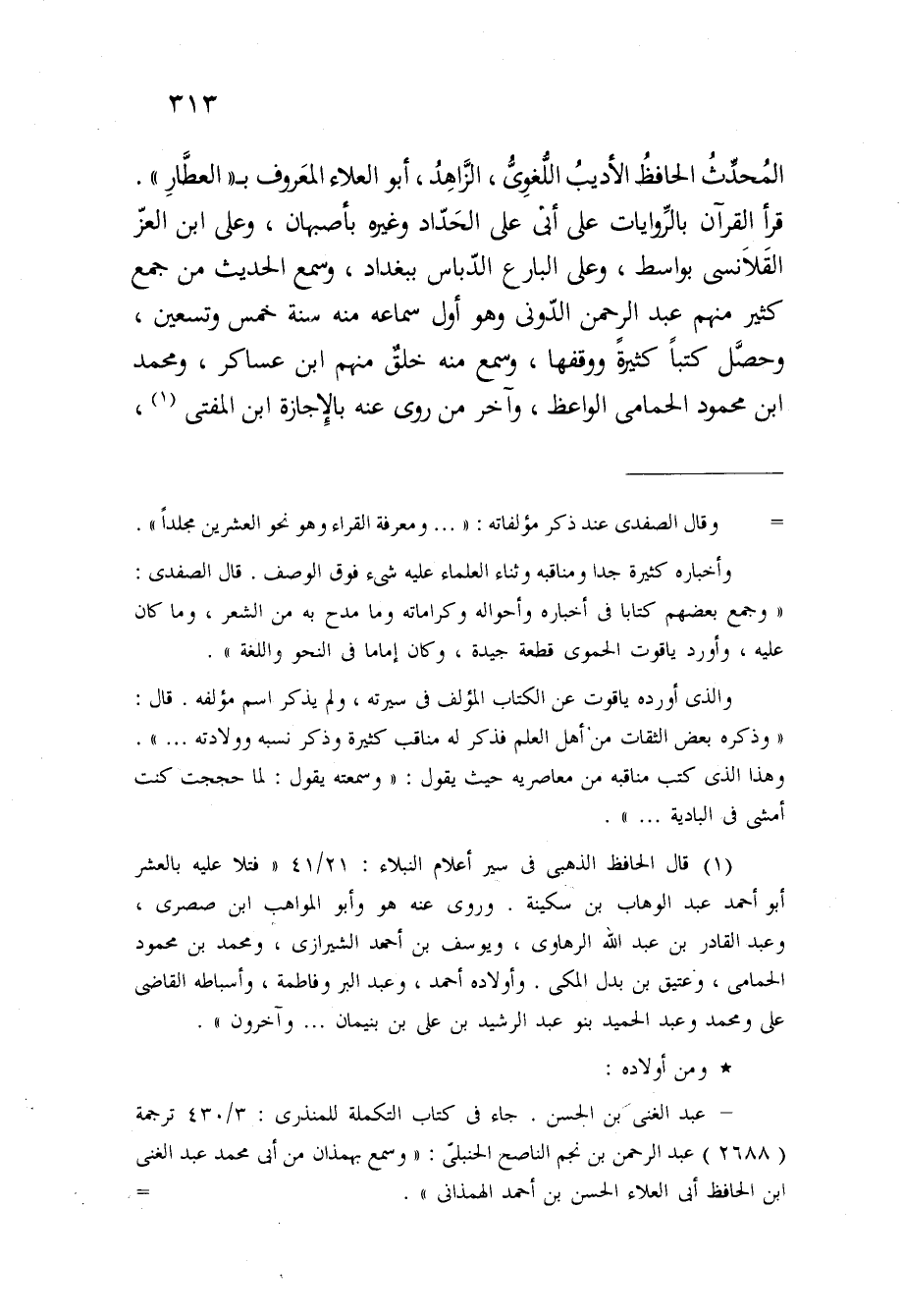 الْمُحدث الْحَافِظ الأديب اللغوى الزَّاهِد أَبُو الْعَلَاء الْمَعْرُوف ب الْعَطَّار قَرَأَ الْقرَان بالروايات على أَبى على الْحداد وَغَيره بأصبهان وعَلى ابْن الْعِزّ القلانسى بواسط وعَلى البارع الدباس بِبَغْدَاد وَسمع الحَدِيث من جمع كثير مِنْهُم عبد الرَّحْمَن الدونى وَهُوَ أول سَمَاعه مِنْهُ سنة خمس وَتِسْعين وَحصل كتبا كَثِيرَة ووقفها وَسمع مِنْهُ خلق مِنْهُم ابْن عَسَاكِر وَمُحَمّد ابْن مَحْمُود الحمامى الْوَاعِظ وَآخر من روى عَنهُ بِالْإِجَازَةِ ابْن الْمُفْتى