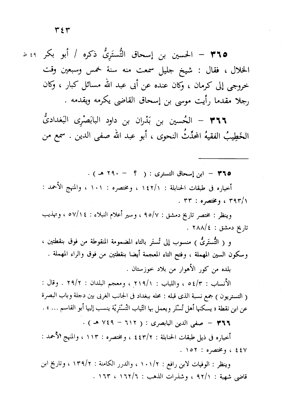 365 - الْحُسَيْن بن إِسْحَاق التسترى ذكره أَبُو بكر الْخلال فَقَالَ شيخ جليل سَمِعت مِنْهُ سنة خمس وَسبعين وَقت خروجى إِلَى كرمان وَكَانَ عِنْده عَن أَبى عبد الله مسَائِل كبار وَكَانَ رجلا مقدما رَأَيْت مُوسَى بن إِسْحَاق القاضى يُكرمهُ ويقدمه