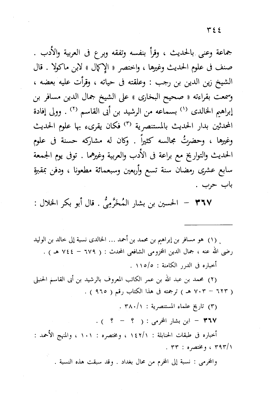 قَالَ الشَّيْخ زين الدّين بن رَجَب وعلقته فى حَيَاته وقرأت عَلَيْهِ بعضه وَسمعت بقرَاءَته صَحِيح البخارى على الشَّيْخ جمال الدّين مُسَافر بن إِبْرَاهِيم الخالدى بِسَمَاعِهِ من الرشيد بن أَبى الْقَاسِم