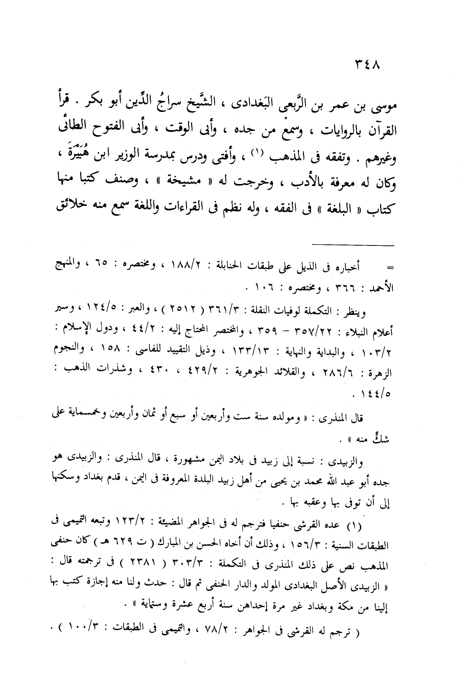 وتفقه فى الْمَذْهَب وَأفْتى ودرس بمدرسة الْوَزير ابْن هُبَيْرَة وَكَانَ لَهُ معرفَة بالأدب وَخرجت لَهُ مشيخة وصنف كتبا مِنْهَا كتاب الْبلْغَة فى الْفِقْه وَله نظم فى الْقرَاءَات واللغة سمع مِنْهُ خلائق