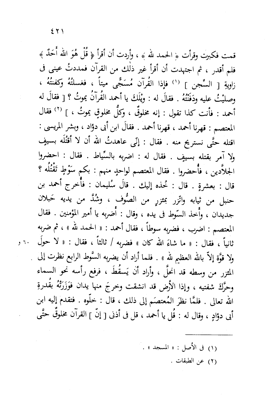 فَقَالَ لَهُ وَيلك يَا أَحْمد الْقرَان يَمُوت فَقَالَ لَهُ أَحْمد فَأَنت كَذَا تَقول إِنَّه مَخْلُوق وكل مَخْلُوق يَمُوت فَقَالَ المعتصم قهرنا أَحْمد قهرنا أَحْمد