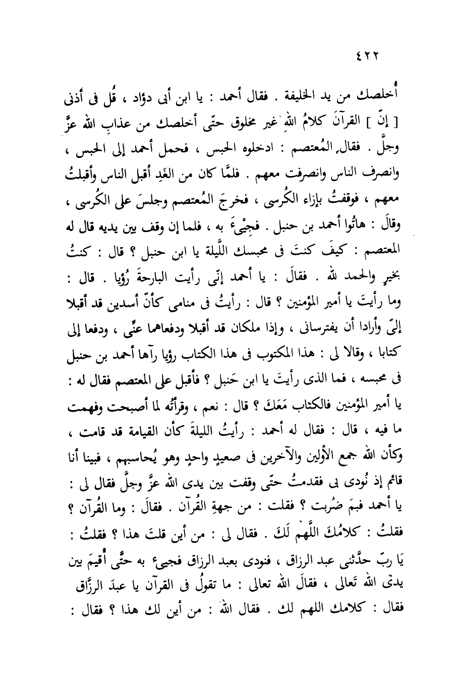 فَقَالَ أَحْمد يَا ابْن أَبى دؤاد قل فى أذنى إِن الْقرَان كَلَام الله غير مَخْلُوق حَتَّى أخلصك من عَذَاب الله عز وَجل