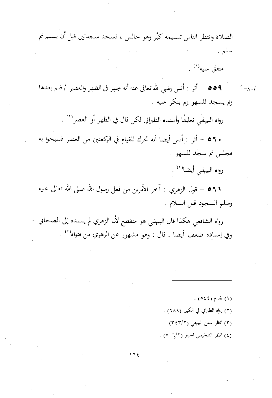 560- أثر: أنس أيضًا أنه تحرك للقيام في الركعتين من العصر فسبحوا به فجلس ثم سجد للسهو.
