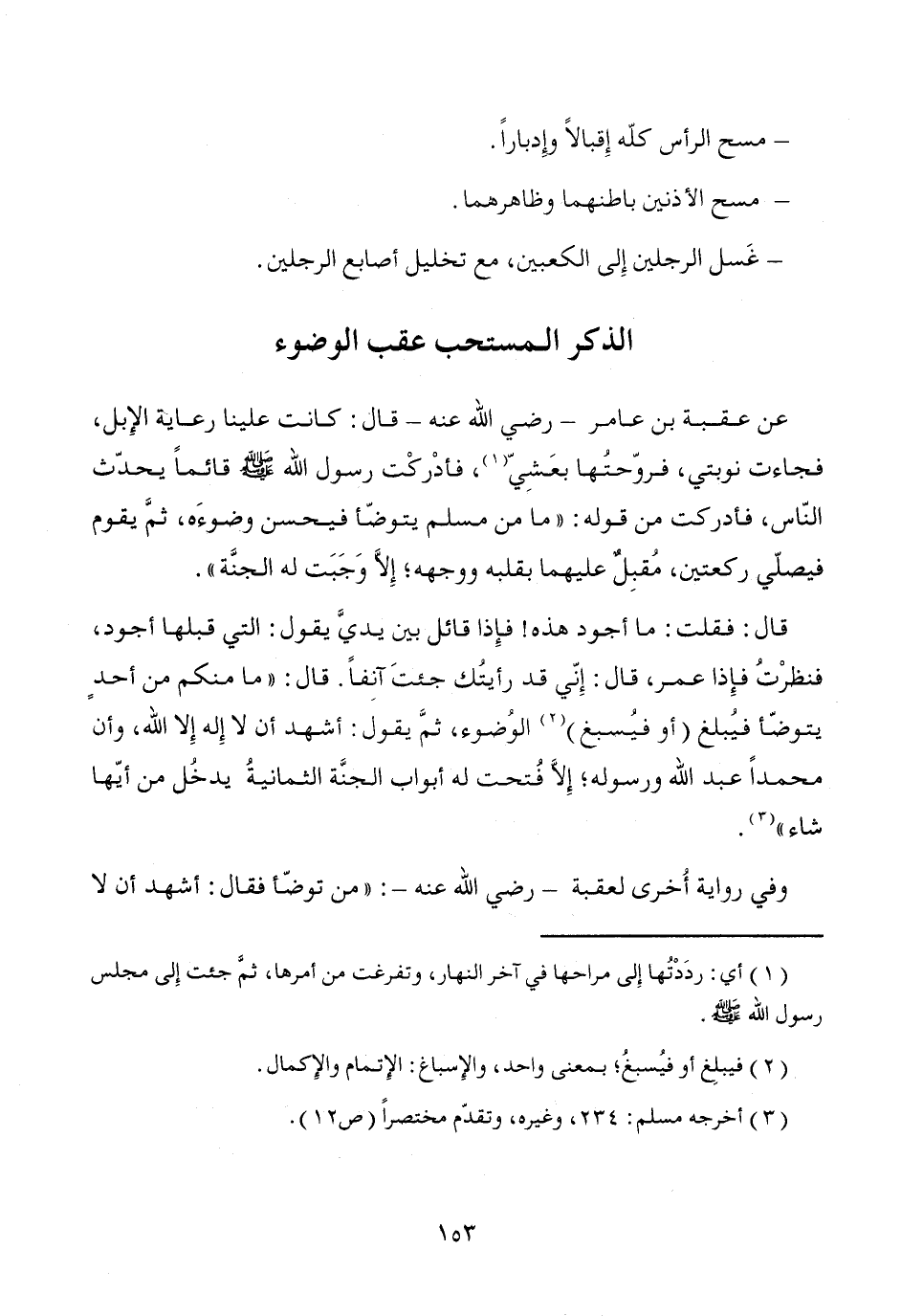 عن عقبة بن عامر -رضي الله عنه- قال: كانت علينا رعايه الإِبل، فجاءت نوبتي، فروّحتُها بعَشِيّ (¬1)، فأدْركْت رسول الله - صَلَّى اللَّهُ عَلَيْهِ وَسَلَّمَ - قائماً يحدّث النّاس، فأدركت من قوله: "ما من مسلم يتوضّأ فيحسن وضوءَه، ثمَّ يقوم فيصلّي ركعتين، مُقبِلٌ عليهما بقلبه ووجهه؛ إلاَّ وَجَبَت له الجنَّة".