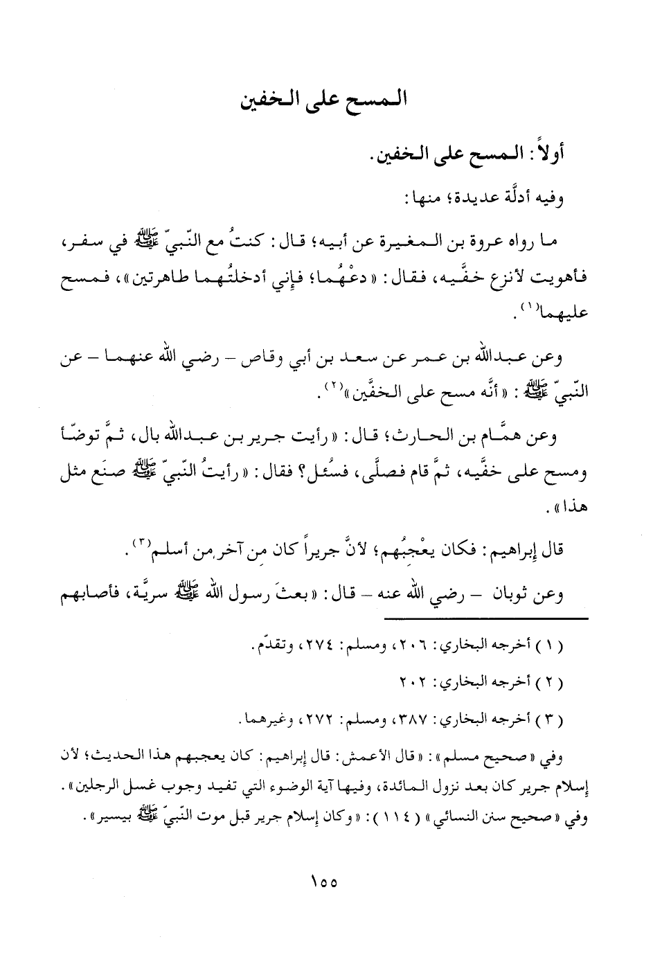 وعن همَّام بن الحارث؛ قال: "رأيت جرير بن عبد الله بال، ثمَّ توضّأ ومسح على خفَّيه، ثمَّ قام فصلَّى، فسُئل؟ فقال: "رأيتُ النّبيّ - صَلَّى اللَّهُ عَلَيْهِ وَسَلَّمَ - صنَع مثل هذا".