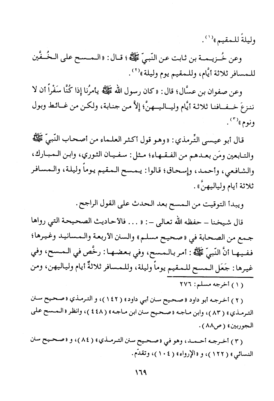 قال شيخنا -حفظه الله تعالى-: " ... فالأحاديث الصحيحه التي رواها جمع من الصحابة في "صحيح مسلم" والسنن الأربعة والمسانيد وغيرها؛ ففيها أنَّ النّبيّ - صَلَّى اللَّهُ عَلَيْهِ وَسَلَّمَ -: أمر بالمسح، وفي بعضها: رخَّص في المسح، وفي غيرها: جَعَل المسح للمقيم يوماً وليلة، وللمسافر ثلاثةٌ أيام ولياليهن، ومن