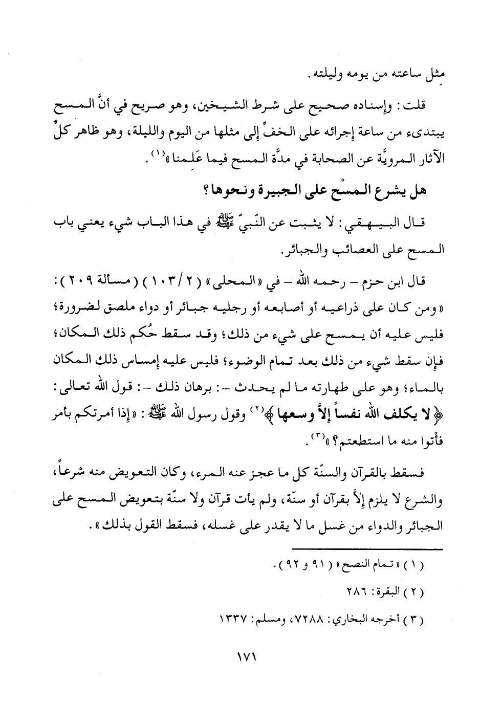 قال ابن حزم -رحمه الله- في "المحلى" (2/ 103) (مسألة 209): "ومن كان على ذراعيه أو أصابعه أو رجليه جبائر أو دواء ملصق لضرورة؛ فليس عليه أن يمسح على شيء من ذلك؛ وقد سقط حُكم ذلك المكان؛ فإِن سقط شيء من ذلك بعد تمام الوضوء؛ فليس عليه إِمساس ذلك المكان بالماء؛ وهو على طهارته ما لم يحدث -: برهان ذلك-: قول الله تعالى: {لا يكلف الله نفساً إِلاَّ وسعها} (¬2) وقول رسول الله - صَلَّى اللَّهُ عَلَيْهِ وَسَلَّمَ -: "إِذا أمرتكم بأمر فأْتوا منه ما استطعتم؟ " (¬3).
