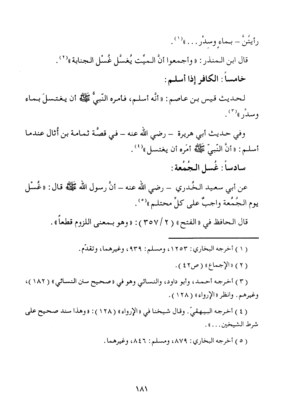 وفي حديث أبي هريرة -رضي الله عنه- في قصَّة ثمامة بن أُثال عندما أسلم: "أنَّ النّبيّ - صَلَّى اللَّهُ عَلَيْهِ وَسَلَّمَ - أمَره أن يغتسل" (¬4).