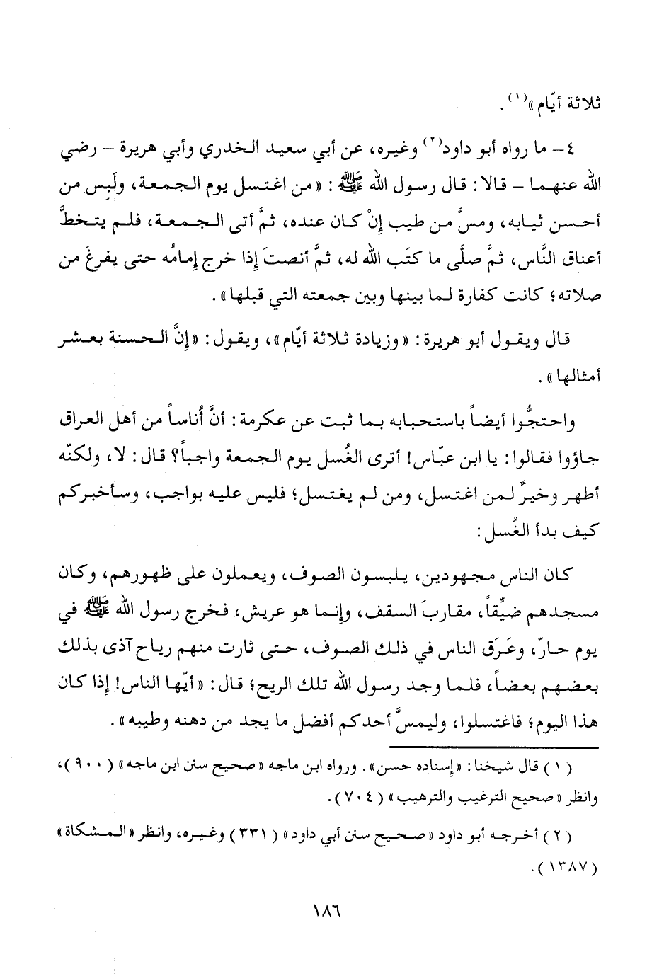 4 - ما رواه أبو داود (¬2) وغيره، عن أبي سعيد الخدري وأبي هريرة -رضي الله عنهما- قالا: قال رسول الله - صَلَّى اللَّهُ عَلَيْهِ وَسَلَّمَ -: "من اغتسل يوم الجمعة، ولَبِس من أحسن ثيابه، ومسَّ من طيب إِنْ كان عنده، ثمَّ أتى الجمعة، فلم يتخطَّ أعناق النَّاس، ثمَّ صلَّى ما كتَب الله له، ثمَّ أنصتَ إِذا خرج إِمامُه حتى يفرغَ من صلاته؛ كانت كفارة لما بينها وبين جمعته التي قبلها".