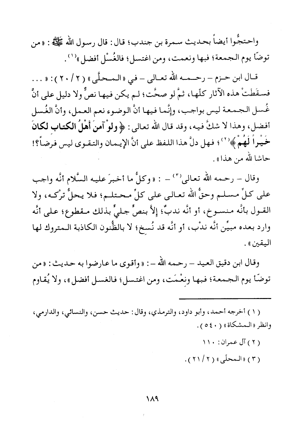قال ابن حزم -رحمه الله تعالى- في "المحلَّى" (2/ 25): " ... فسقَطَتْ هذه الآثار كلّها، ثمَّ لو صحَّت؛ لم يكن فيها نصٌّ ولا دليل على أنّ غسل الجمعة ليس بواجب، وإِنَّما فيها أنَّ الوضوء نعم العمل، وأنَّ الغُسل أفضلِ، وهذا لا شكَّ فيه، وقد قال الله تعالى: {ولوْ آمنَ أَهْلُ الكتابِ لكانَ خَيراَ لَهمْ} (¬2)؛ فهل دلَّ هذا اللفظ على أنَّ الإِيمان والتقوى ليس فرضاً؟! حاشا لله من هذا".