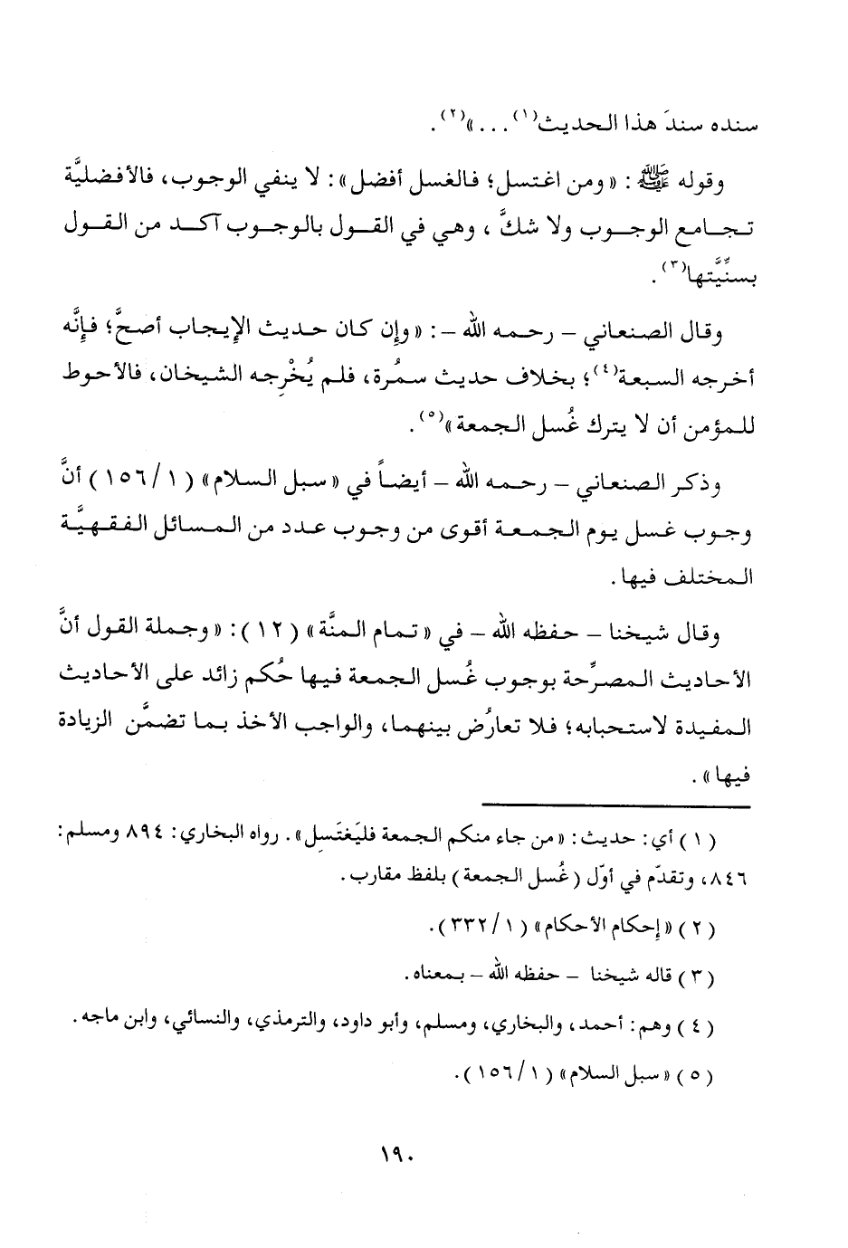 وذكر الصنعاني -رحمه الله- أيضاً في "سبل السلام" (1/ 156) أنَّ وجوب غسل يوم الجمعة أقوى من وجوب عدد من المسائل الفقهيَّة المختلف فيها.