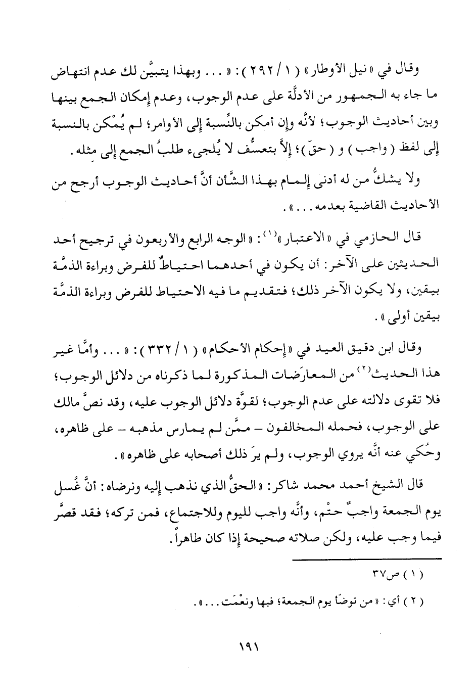 ولا يشكُّ من له أدنى إِلمام بهذا الشَّأن أنَّ أحاديث الوجوب أرجح من الأحاديث القاضية بعدمه ... ".