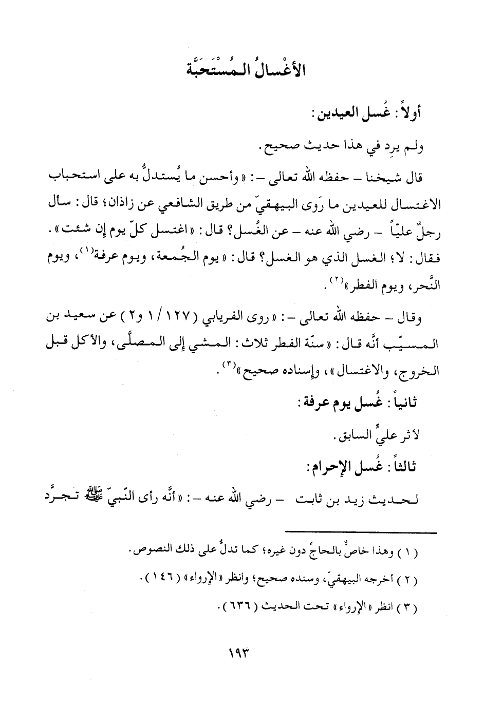 وقال -حفظه الله تعالى-: "روى الفريابي (127/ 1 و2) عن سعيد بن المسيّب أنَّه قال: "سنّة الفطر ثلاث: المشي إِلى المصلَّى، والأكل قبل الخروج، والاغتسال"، وإِسناده صحيح" (¬3).