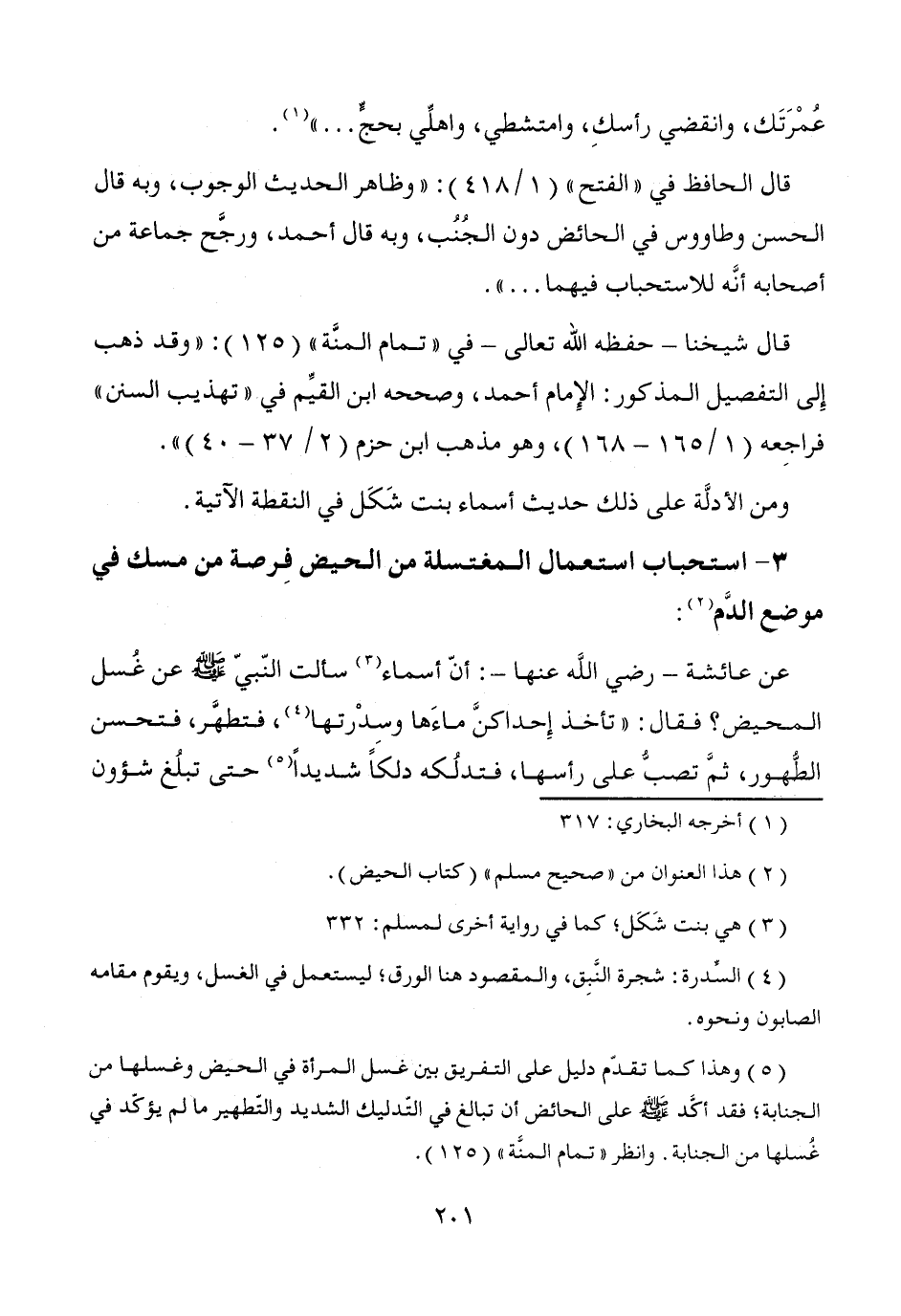 (¬5) وهذا كما تقدّم دليل على التفريق بين غسل المرأة في الحيض وغسلها من الجنابة؛ فقد أكَّد - صَلَّى اللَّهُ عَلَيْهِ وَسَلَّمَ - على الحائض أن تبالغ في التّدليك الشديد والتطهير ما لم يؤكّد في غُسلها من الجنابة. وانظر "تمام المنَّة" (125).