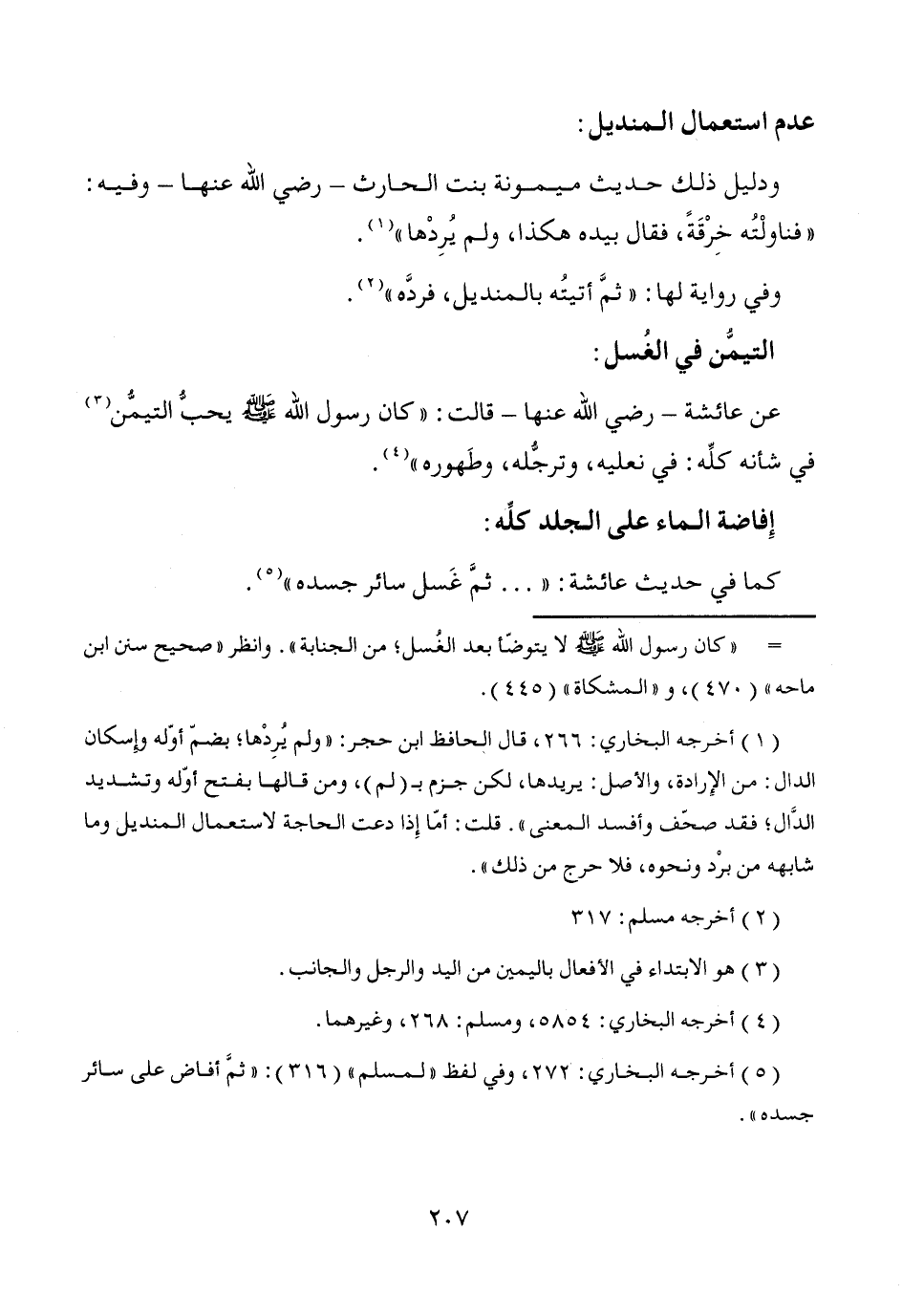 (¬1) أخرجه البخاري: 266، قال الحافظ ابن حجر: "ولم يُرِدْها؛ بضم أوّله وِإسكان الدال: من الإِرادة، والأصل: يريدها، لكن جزم بـ (لم)، ومن قالها بفتح أوّله وتشديد الدَّال؛ فقد صحّف وأفسد المعنى". قلت: أمَا إِذا دعت الحاجة لاستعمال المنديل وما شابهه من برْد ونحوه، فلا حرج من ذلك".