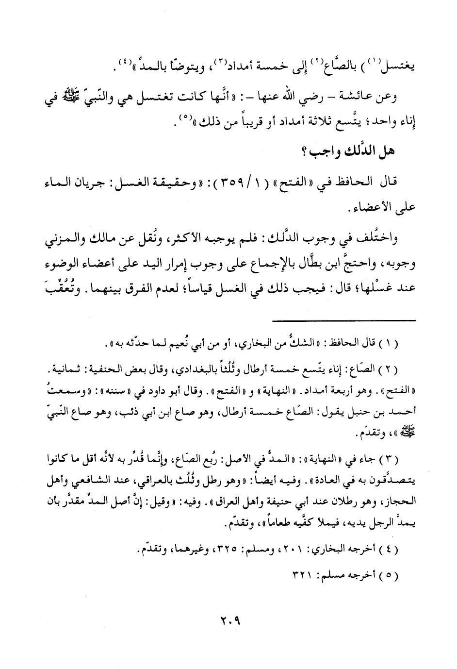 يغتسل (¬1) بالصَّاع (¬2) إِلى خمسة أمداد (¬3)، ويتوضّأ بالمدِّ" (¬4).