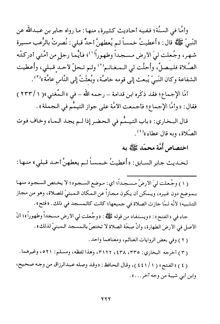 وأمَّا في السنَّة؛ ففيه أحاديث كثيرة، منها: ما رواه جابر بن عبد الله عن النّبيّ - صَلَّى اللَّهُ عَلَيْهِ وَسَلَّمَ - قال: "أُعطيتُ خمساً لم يُعطهنَّ أحدٌ قبلي: نُصرتُ بالرُّعب مسيرة شهر، وجُعِلت ليَ الأرض مسجداً وطهوراً (¬1)؛ فأيُّما رجلٍ من أمَّتي أدركتْه الصَّلاة فليصلِّ، وأُحلَّت لي المغانم (¬2) ولم تحلّ لأحدٍ قبلي، وأُعطيت الشفاعة وكان النّبيّ يُبعث إِلى قومه خاصَّة، وبُعِثْتُ إِلى النَّاسِ عامَّة" (¬3).