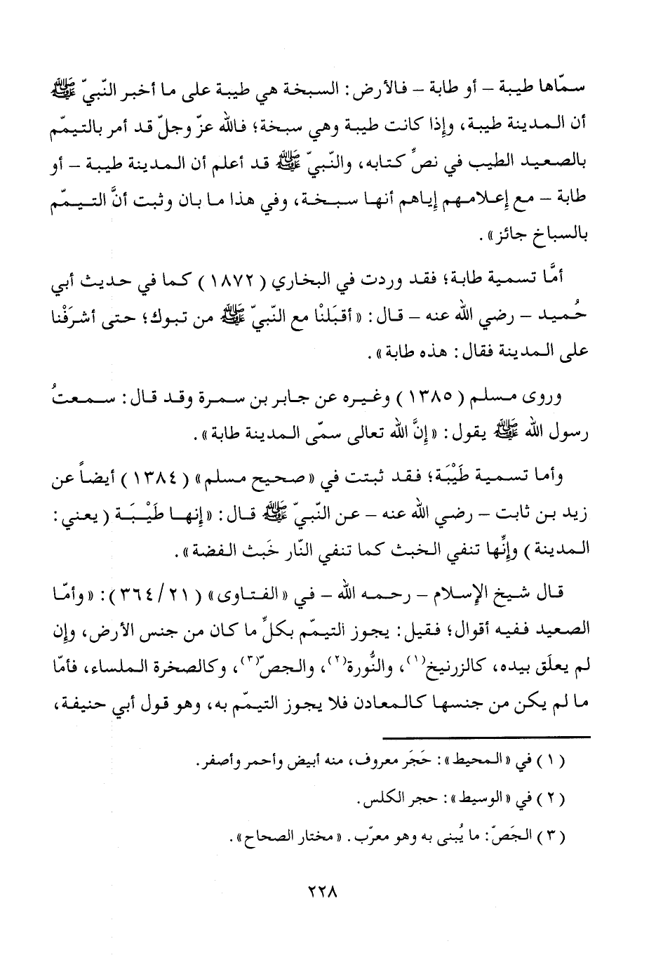 سمّاها طيبة -أو طابة- فالأرض: السبخة هي طيبة على ما أخبر النّبيّ - صَلَّى اللَّهُ عَلَيْهِ وَسَلَّمَ - أن المدينة طيبة، وإِذا كانت طيبة وهي سبخة؛ فالله عزّ وجلّ قد أمر بالتيمّم بالصعيد الطيب في نصِّ كتابه، والنّبيّ - صَلَّى اللَّهُ عَلَيْهِ وَسَلَّمَ - قد أعلم أن المدينة طيبة -أو طابة- مع إِعلامهم إِياهم أنها سبخة، وفي هذا ما بان وثبت أنَّ التيمُّم بالسباخ جائز".