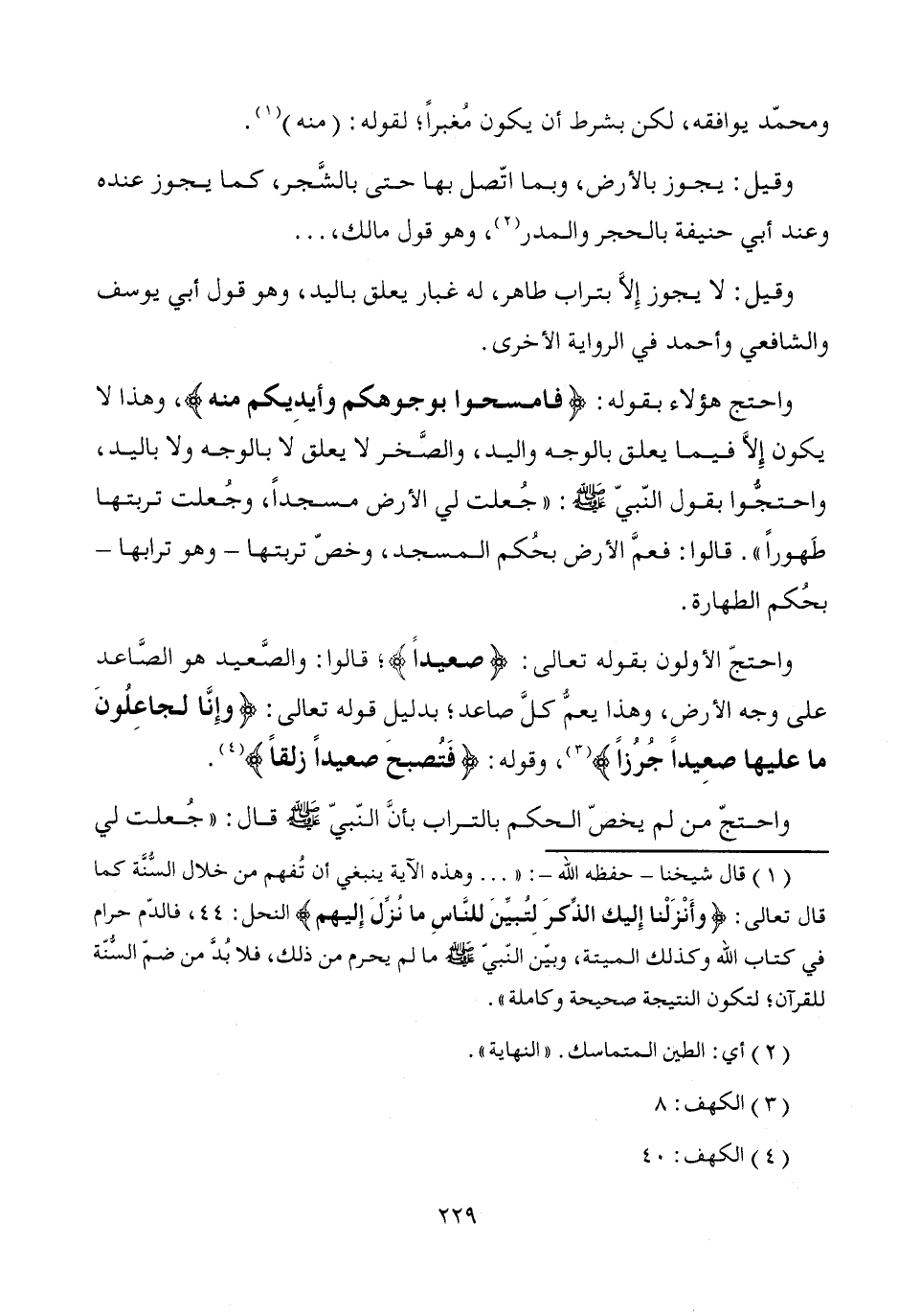 واحتج هؤلاء بقوله: {فامسحوا بوجوهكم وأيدِيكم منه}، وهذا لا يكون إلاَّ فيما يعلق بالوجه واليد، والصَّخر لا يعلق لا بالوجه ولا باليد، واحتجُّوا بقول النّبيّ - صَلَّى اللَّهُ عَلَيْهِ وَسَلَّمَ -: "جُعلت لي الأرض مسجداً، وجُعلت تربتها طَهوراً". قالوا: فعمَّ الأرض بحُكم المسجد، وخصّ تربتها -وهو ترابها- بحُكم الطهارة.