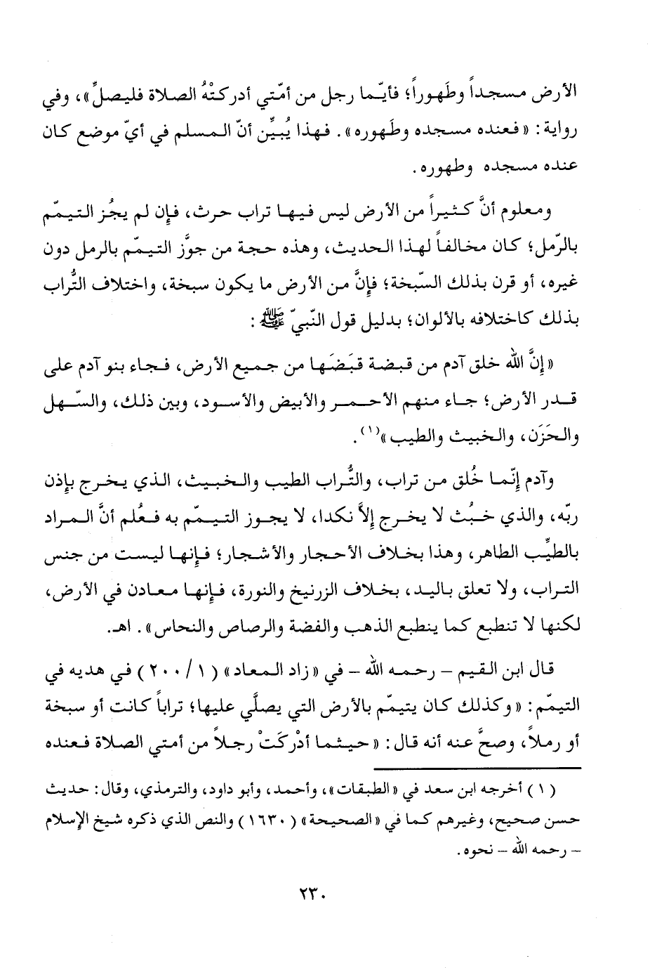 ومعلوم أنَّ كثيراً من الأرض ليس فيها تراب حرث، فإِن لم يجُز التيمُّم بالرّمل؛ كان مخالفاً لهذا الحديث، وهذه حجة من جوَّز التيمُّم بالرمل دون غيره، أو قرن بذلك السّبخة؛ فإِنَّ من الأرض ما يكون سبخة، واختلاف التُّراب بذلك كاختلافه بالألوان؛ بدليل قول النّبيّ - صَلَّى اللَّهُ عَلَيْهِ وَسَلَّمَ -:
