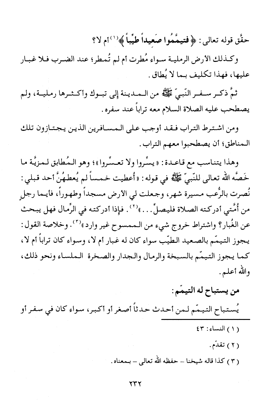 ثمَّ ذكر سفر النّبيّ - صَلَّى اللَّهُ عَلَيْهِ وَسَلَّمَ - من المدينة إِلى تبوك وأكثرها رملية، ولم يصطحب عليه الصلاة السلام معه تراباً عند سفره.