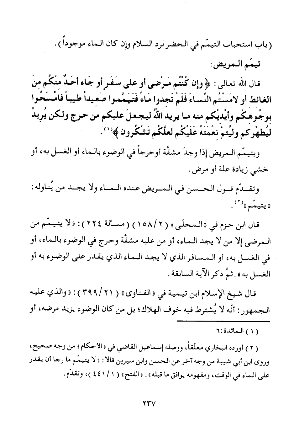 قال ابن حزم في "المحلى" (2/ 158) (مسألة 224): "لا يتيمّم من المرضى إِلا من لا يجد الماء، أو من عليه مشقَّة وحرج في الوضوء بالماء، أو في الغسل به، أو المسافر الذي لا يجد الماء الذي يقدر على الوضوء به أو الغسل به". ثمَّ ذكر الآية السابقة.