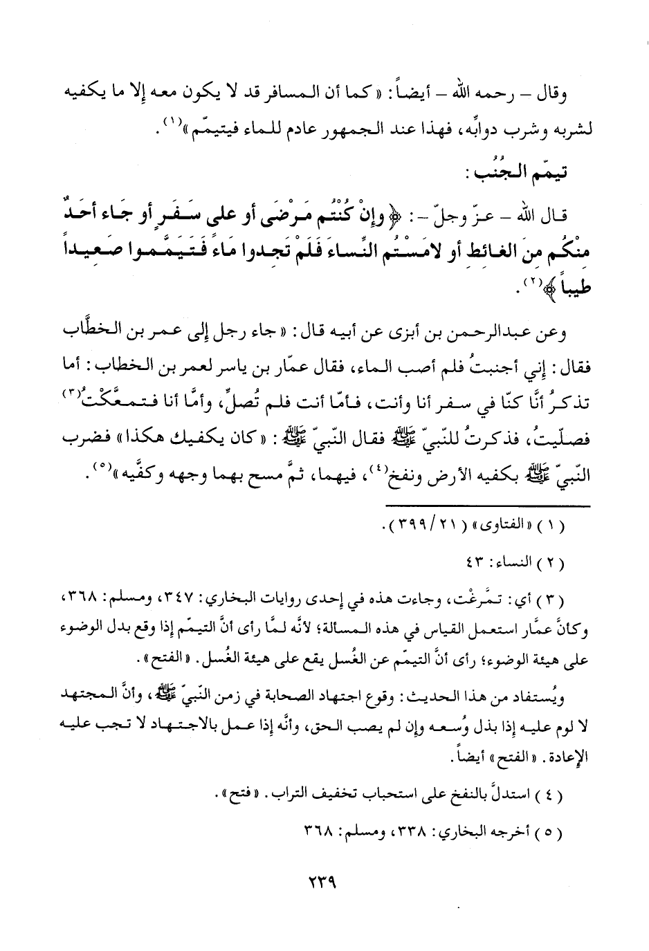 وقال -رحمه الله- أيضاً: "كما أن المسافر قد لا يكون معه إِلا ما يكفيه لشربه وشرب دوابِّه، فهذا عند الجمهور عادم للماء فيتيمّم" (¬1).