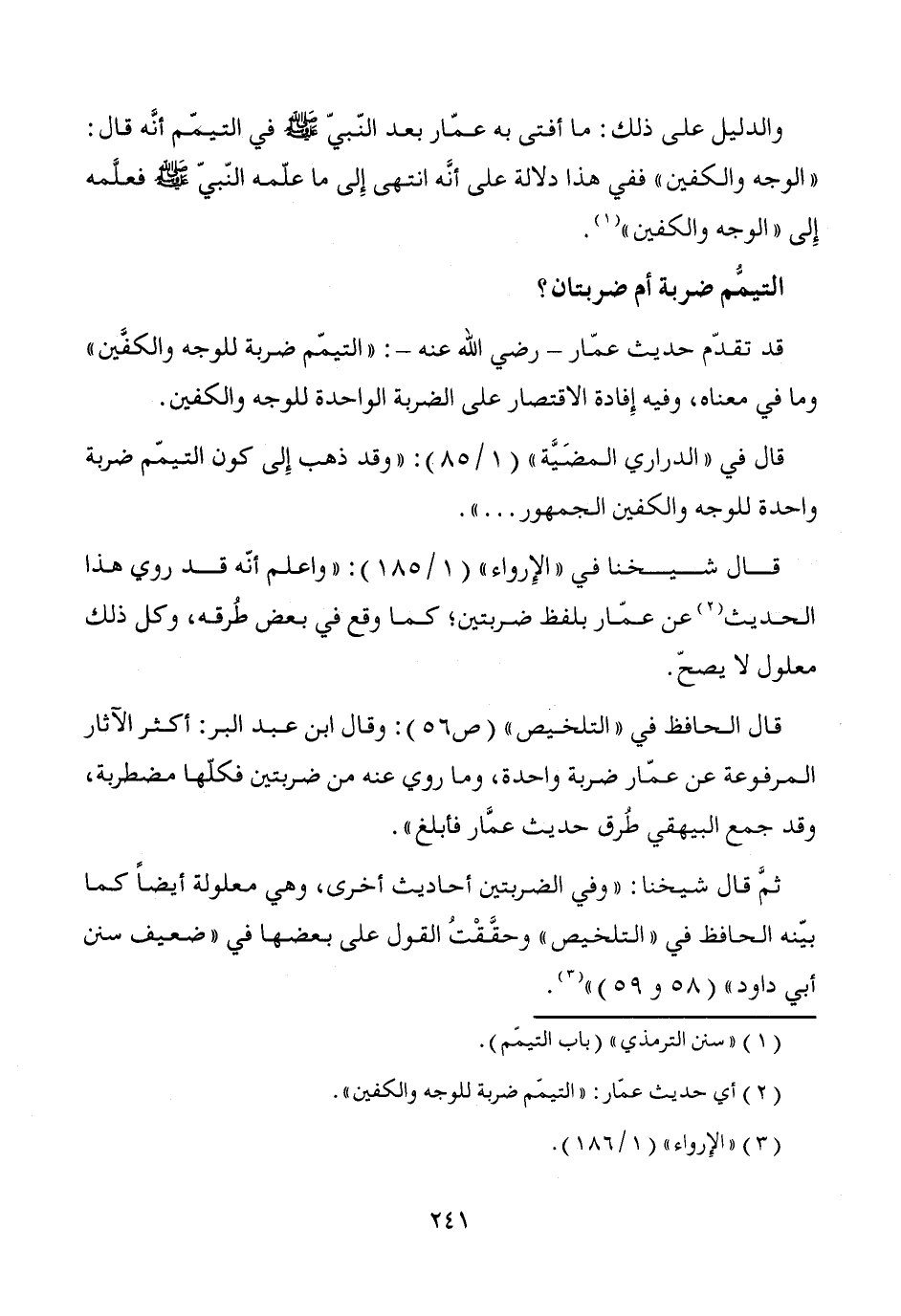 قال شيخنا في "الإِرواء" (1/ 185): "واعلم أنّه قد روي هذا الحديث (¬2) عن عمّار بلفظ ضربتين؛ كما وقع في بعض طُرقه، وكل ذلك معلول لا يصحّ.