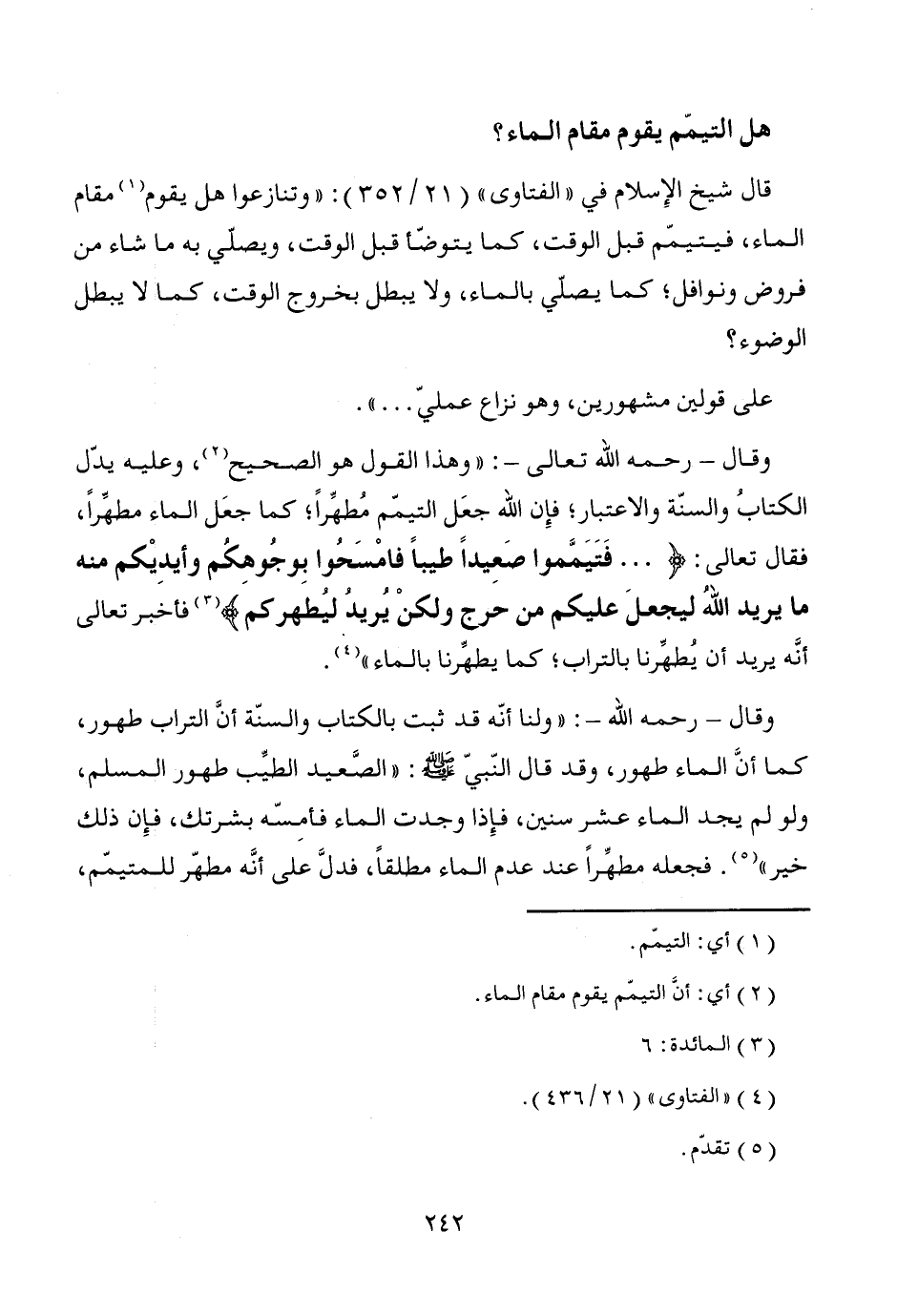 وقال -رحمه الله تعالى-: "وهذا القول هو الصحيح (¬2)، وعليه يدّل الكتابُ والسنّة والاعتبار؛ فإِن الله جعَل التيمُّم مُطهِّراً؛ كما جعَل الماء مطهِّراً، فقال تعالى: { ... فَتَيَمَّمُوا صَعِيدًا طَيِّبًا فَامْسَحُوا بِوُجُوهِكُمْ وَأَيْدِيكُمْ مِنْهُ مَا يُرِيدُ اللَّهُ لِيَجْعَلَ عَلَيْكُمْ مِنْ حَرَجٍ وَلَكِنْ يُرِيدُ لِيُطَهِّرَكُمْ} (¬3) فأخبر تعالى أنَّه يريد أن يُطهِّرنا بالتراب؛ كما يطهِّرنا بالماء" (¬4).