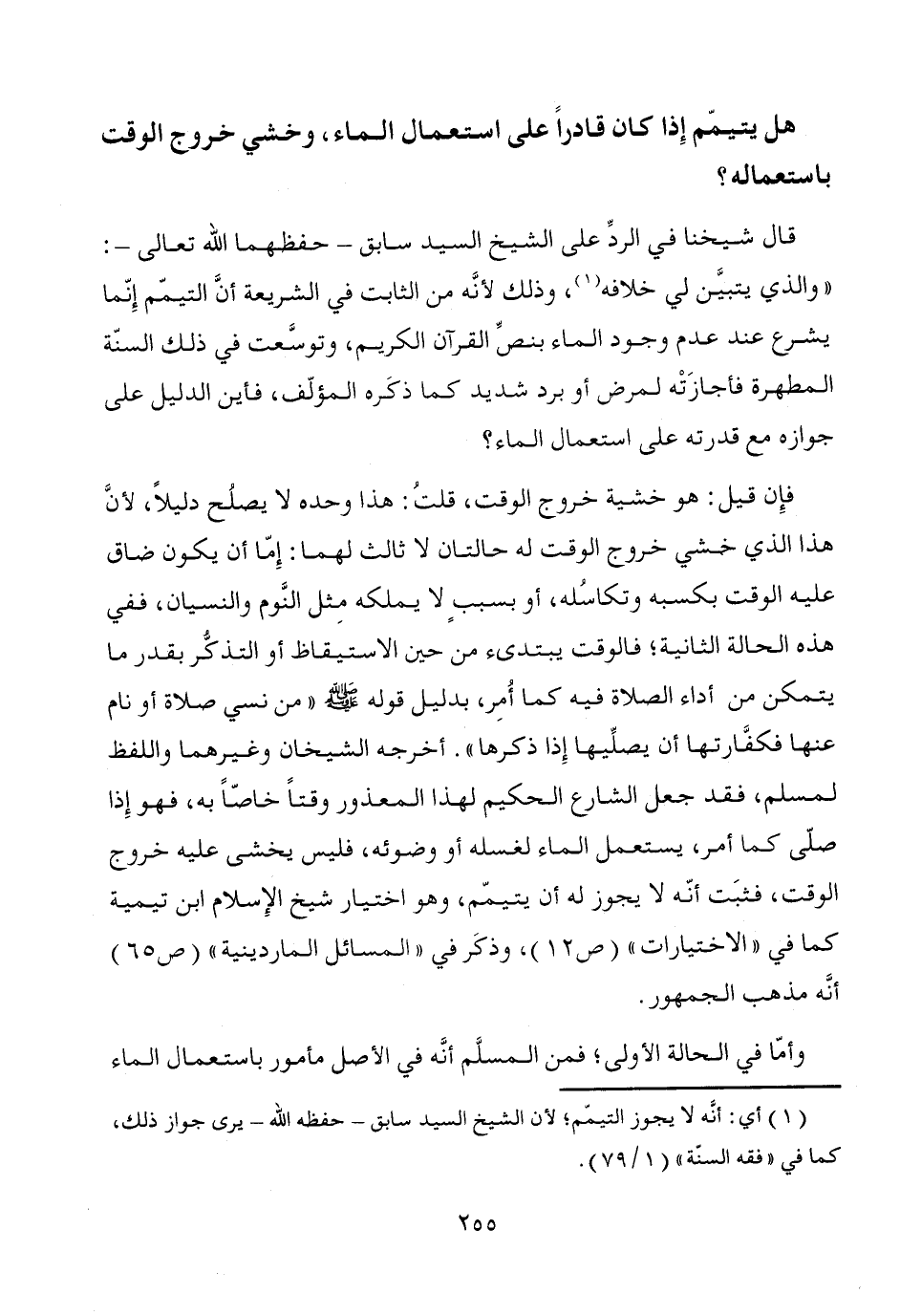 فإِن قيل: هو خشية خروج الوقت، قلتُ: هذا وحده لا يصلُح دليلاً، لأنَّ هذا الذي خشي خروج الوقت له حالتان لا ثالث لهما: إِمّا أن يكون ضاق عليه الوقت بكسبه وتكاسُله، أو بسببٍ لا يملكه مِثل النَّوم والنسيان، ففي هذه الحالة الثانية؛ فالوقت يبتدئ من حين الاستيقاظ أو التذكُّر بقدر ما يتمكن من أداء الصلاة فيه كما أُمِر، بدليل قوله - صَلَّى اللَّهُ عَلَيْهِ وَسَلَّمَ - "من نسي صلاة أو نام عنها فكفَّارتها أن يصلِّيها إِذا ذكرها". أخرجه الشيخان وغيرهما واللفظ لمسلم، فقد جعل الشارع الحكيم لهذا المعذور وقتاً خاصّاً به، فهو إِذا صلّى كما أمر، يستعمل الماء لغسله أو وضوئه، فليس يخشى عليه خروج الوقت، فثبَت أنّه لا يجوز له أن يتيمّم، وهو اختيار شيخ الإِسلام ابن تيمية كما في "الاختيارات" (ص12)، وذكَر في "المسائل الماردينية" (ص 65) أنَّه مذهب الجمهور.