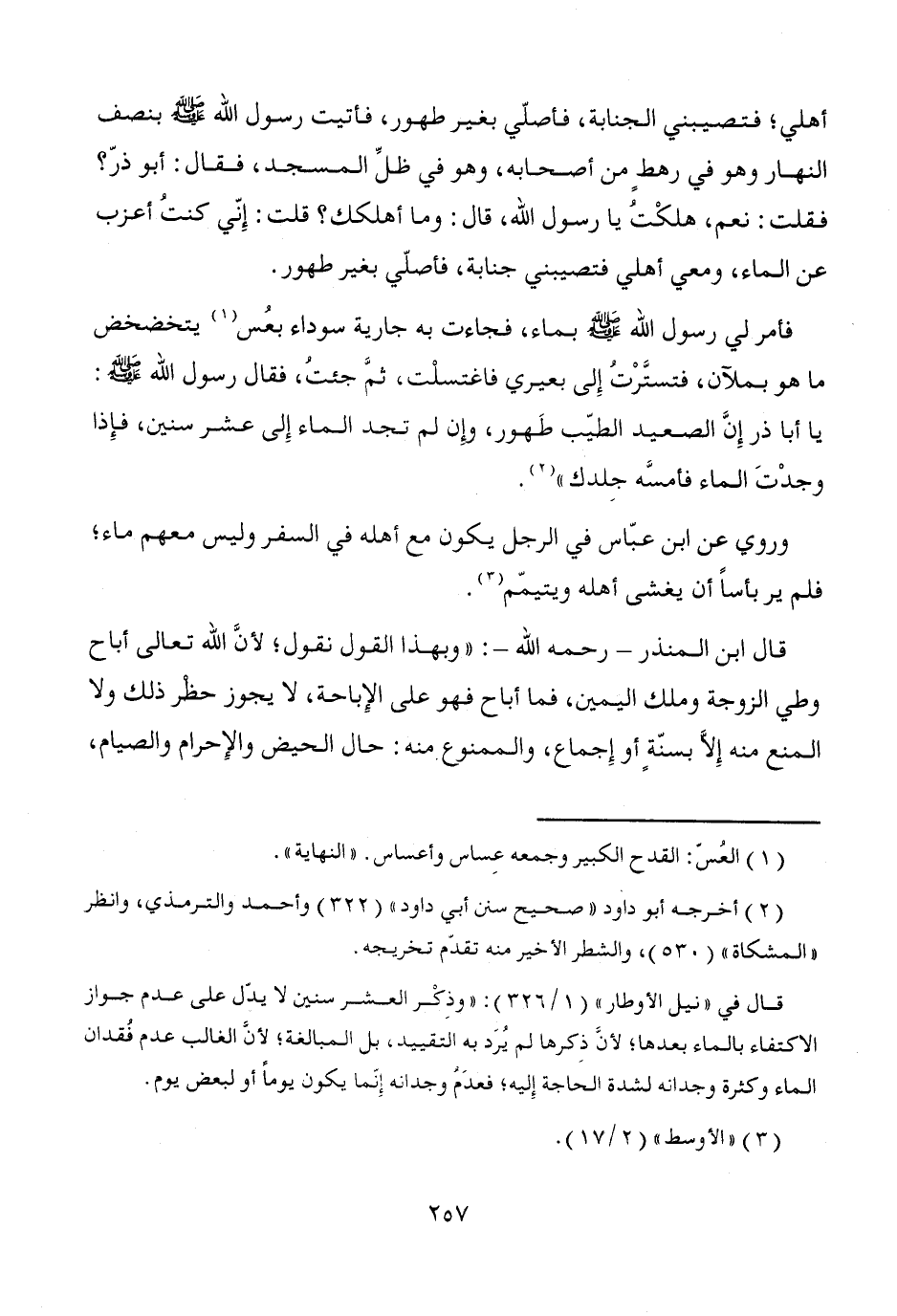 أهلي؛ فتصيبني الجنابة، فأصلّي بغير طهور، فأتيت رسول الله - صَلَّى اللَّهُ عَلَيْهِ وَسَلَّمَ - بنصف النهار وهو في رهطٍ من أصحابه، وهو في ظلِّ المسجد، فقال: أبو ذرّ؟ فقلت: نعم، هلكْتُ يا رسول الله، قال: وما أهلكك؟ قلت: إِنّي كنتُ أعزب عن الماء، ومعي أهلي فتصيبني جنابة، فأصلّي بغير طهور.