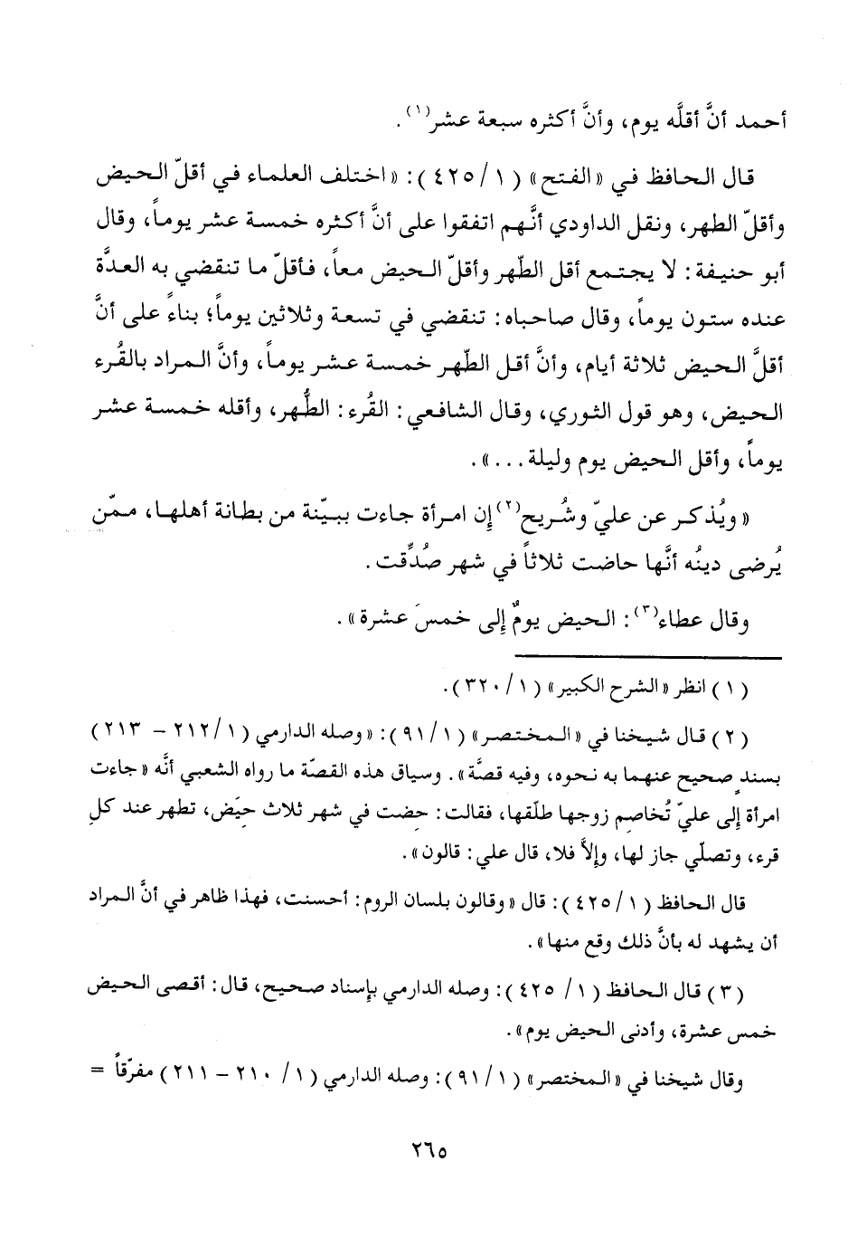 قال الحافظ في "الفتح" (1/ 425): "اختلف العلماء في أقلّ الحيض وأقلّ الطهر، ونقل الداودي أنَّهم اتفقوا على أنَّ أكثره خمسة عشر يوماً، وقال أبو حنيفة: لا يجتمع أقل الطُّهر وأقلّ الحيض معاً، فأقل ما تنقضي به العدَّة عنده ستون يوماً، وقال صاحباه: تنقضي في تسعة وثلاثين يوماً؛ بناءً على أنَّ أقلَّ الحيض ثلاثة أيام، وأنَّ أقل الطّهر خمسة عشر يوماً، وأنَّ المراد بالقُرء الحيض، وهو قول الثوري، وقال الشافعي: القُرء: الطُّهر، وأقله خمسة عشر يوماً، وأقل الحيض يوم وليلة ... ".