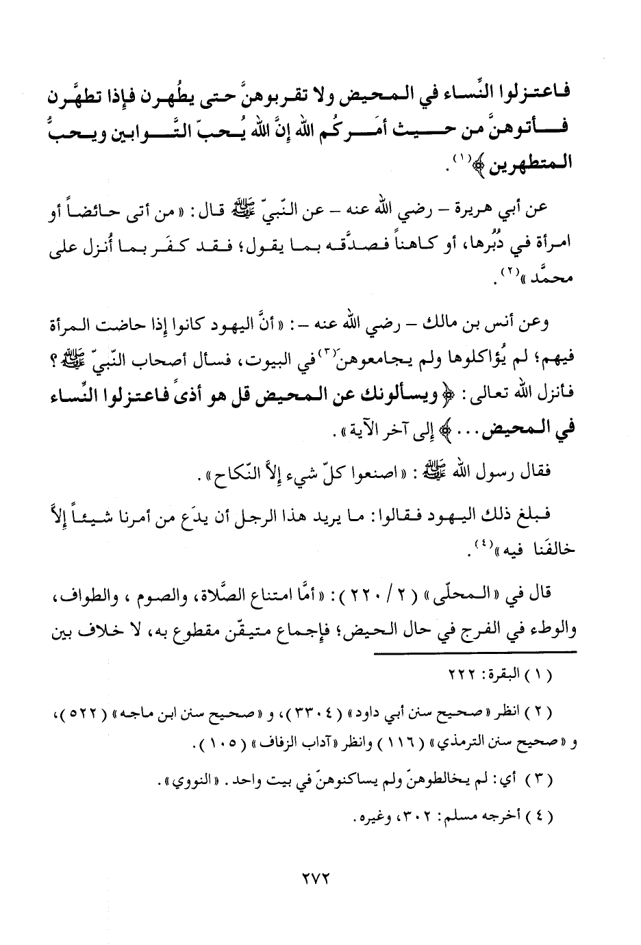 فاعتزلوا النِّساء في المحيض ولا تقربوهنَّ حتى يطُهُرن فإِذا تطهَّرن فأتوهنَّ من حيث أمَركُم الله إِنَّ الله يُحبّ التَّوابين ويحبّ المتطهرين} (¬1).