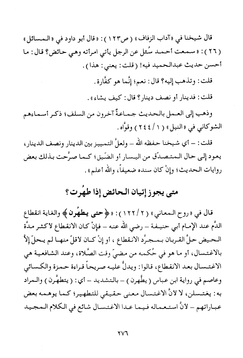 قال شيخنا في "آداب الزفاف" (ص 123): "قال أبو داود في "المسائل" (26): "سمعت أحمد سُئل عن الرجل يأتي امرأته وهي حائض؛ قال: ما أحسن حديث عبد الحميد فيه! (قلت: يعني: هذا).