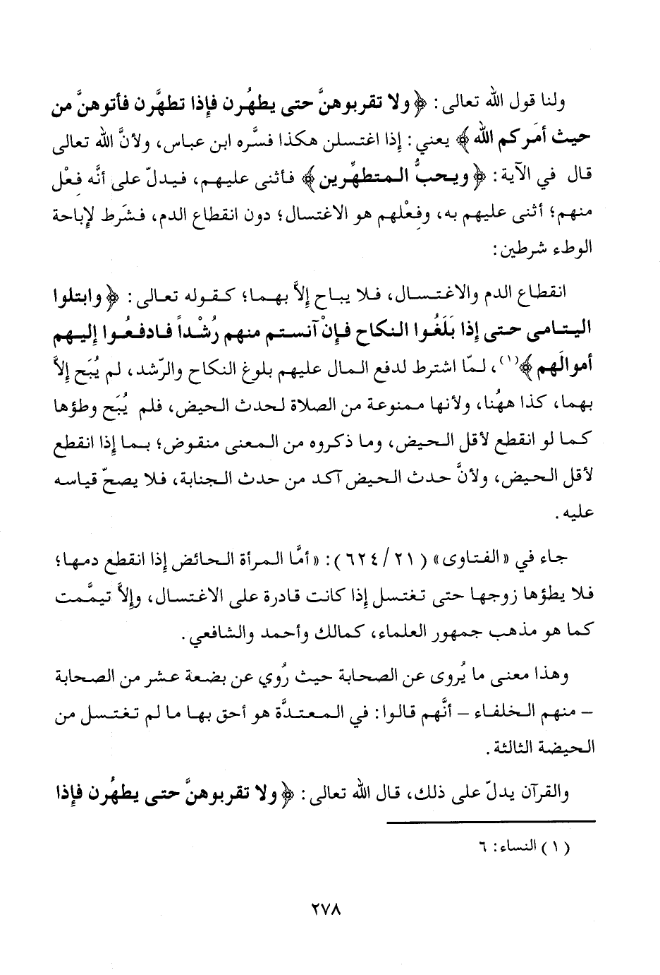 انقطاع الدم والاغتسال، فلا يباح إلاَّ بهما؛ كقوله تعالى: {وابتلوا اليتامى حتى إِذا بَلَغُوا النكاح فإِنْ آنستم منهم رُشْداً فادفعُوا إِليهم أموالَهم} (¬1)، لمّا اشترط لدفع المال عليهم بلوغ النكاح والرّشد، لم يُبَح إلاَّ بهما، كذا هاهُنا، ولأنها ممنوعة من الصلاة لحدث الحيض، فلم يُبَح وطؤها كما لو انقطع لأقل الحيض، وما ذكروه من المعنى منقوض؛ بما إِذا انقطع لأقل الحيض، ولأنَّ حدث الحيض آكد من حدث الجنابة، فلا يصحّ قياسه عليه.