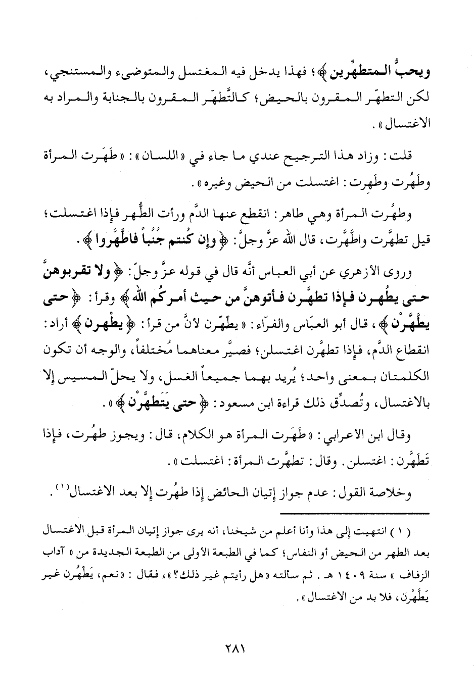 (¬1) انتهيت إِلى هذا وأنا أعلم من شيخنا، أنه يرى جواز إتيان المرأة قبل الاغتسال بعد الطهر من الحيض أو النفاس؛ كما في الطبعة الأولى من الطبعة الجديدة من "آداب الزفاف" سنة 1409هـ. ثم سألته "هل رأيتم غير ذلك؟ "، فقال: "نعم، يَطْهُرن غير يَطَّهْرن، فلا بد من الاغتسال".