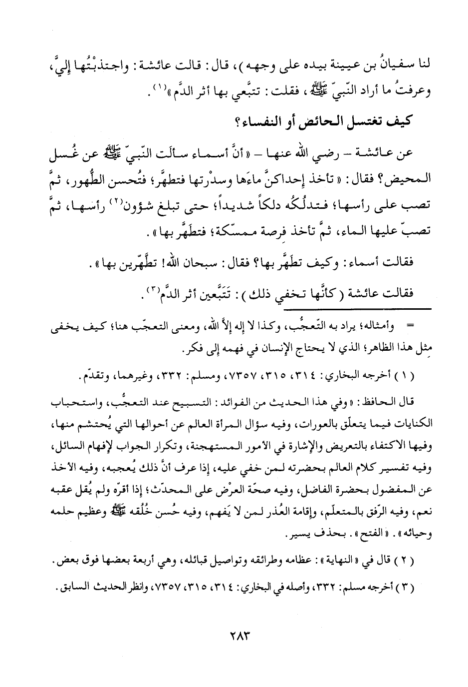 قال الحافظ: "وفي هذا الحديث من الفوائد: التسبيح عند التعجُّب، واستحباب الكنايات فيما يتعلّق بالعورات، وفيه سؤال المرأة العالم عن أحوالها التي يُحتشم منها، وفيها الاكتفاء بالتعريض والإشارة في الأمور المستهجنة، وتكرار الجواب لإفهام السائل، وفيه تفسير كلام العالم بحضرته لمن خفي عليه، إِذا عرف أن ذلك يُعجبه، وفيه الأخذ عن المفضول بحضرة الفاضل، وفيه صحّة العرْض على المحدّث؛ إِذا أقرّه ولم يُقل عقبه نعم، وفيه الرّفق بالمتعلّم، وإقامة العُذر لمن لا يَفهم، وفيه حُسن خُلُقه - صَلَّى اللَّهُ عَلَيْهِ وَسَلَّمَ - وعظيم حلمه وحيائه". "الفتح". بحذف يسير.