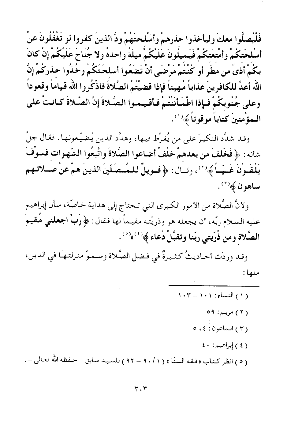 وقد شدَّد النكيرَ على من يُفرِّط فيها، وهدَّد الذين يُضيّعونها. فقال جلَّ شأنه: {فَخَلفَ من بعدهِم خلْفٌ أضاعوا الصَّلاةَ واتَّبعُوا الشّهواتِ فسوْفَ يَلْقَوْنَ غَيّاً} (¬2)، وقال: {فويلٌ للمُصَلّينَ * الذينَ همْ عنْ صلاتهم ساهون} (¬3).