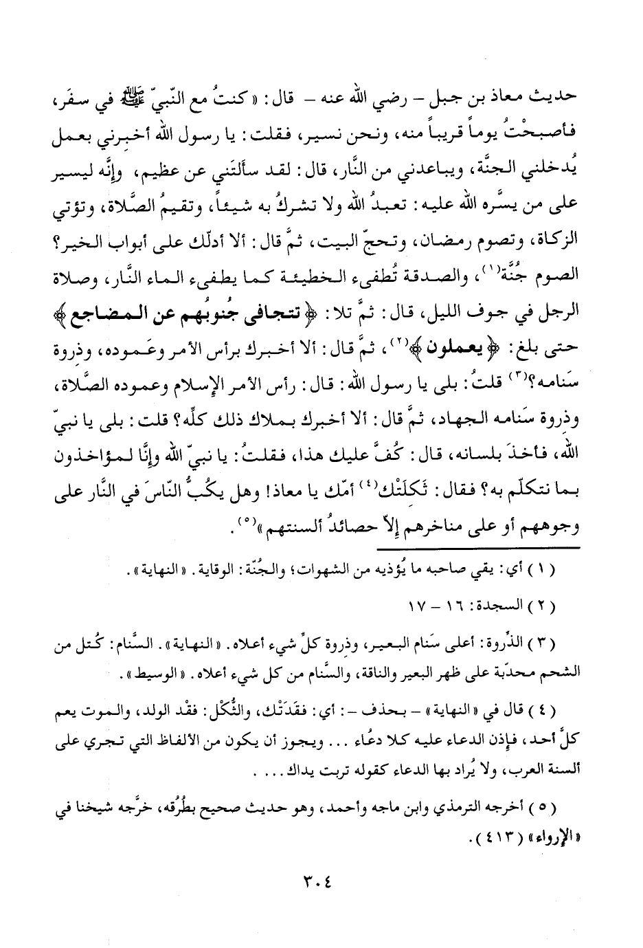 حديث معاذ بن جبل -رضي الله عنه- قال: "كنتُ مع النّبيّ - صَلَّى اللَّهُ عَلَيْهِ وَسَلَّمَ - في سفَر، فأصبحْتُ يوماً قريباً منه، ونحن نسير، فقلت: يا رسول الله أخبِرني بعمل يُدخلني الجنَّة، ويباعدني من النَّار، قال: لقد سأَلتَني عن عظيم، وإنَّه ليسير على من يسَّره الله عليه: تعبدُ الله ولا تشركُ به شيئاً، وتقيمُ الصَّلاة، وتؤتي الزكاة، وتصوم رمضان، وتحجّ البيت، ثمَّ قال: ألا أدلّك على أبواب الخير؟ الصوم جُنَّة (¬1)، والصدقة تُطفئ الخطيئة كما يطفئ الماء النَّار، وصلاة الرجل في جوف الليل، قال: ثمَّ تلا: {تتجافى جُنوبُهم عن المضاجع} حتى بلغ: {يعملون} (¬2)، ثمَّ قال: ألا أخبرك برأس الأمر وعَموده، وذِروة سَنامه؟ (¬3) قلتُ: بلى يا رسول الله: قال: رأس الأمر الإِسلام وعموده الصَّلاة، وذروة سَنامه الجهاد، ثمَّ قال: ألا أخبرك بملاك ذلك كلِّه؟ قلت: بلى يا نبيّ اللهَ، فأخذَ بلسانه، قال: كُفَّ عليك هذا، فقلتُ: يا نبيّ الله وإِنَّا لمؤاخذون بما نتكلّم به؟ فقال: ثَكِلَتْك (¬4) أمّك يا معاذ! وهل يكُبُّ النّاسَ في النَّار على وجوههم أو على مناخرهم إلاَّ حصائدُ ألسنتهم" (¬5).