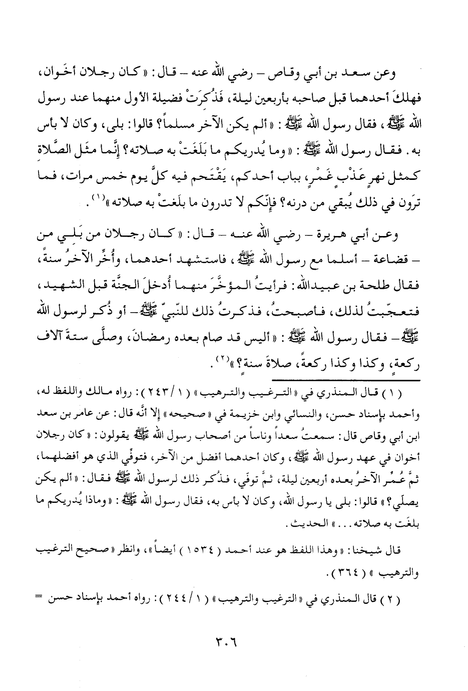(¬1) قال المنذري في "الترغيب والترهيب" (1/ 243): رواه مالك واللفظ له، وأحمد بإِسناد حسن، والنسائي وابن خزيمة في "صحيحه" إِلا أنَّه قال: عن عامر بن سعد ابن أبي وقاص قال: سمعتُ سعداً وناساً من أصحاب رسول الله - صَلَّى اللَّهُ عَلَيْهِ وَسَلَّمَ - يقولون: "كان رجلان أخوان في عهد رسول الله - صَلَّى اللَّهُ عَلَيْهِ وَسَلَّمَ -، وكان أحدهما أفضل من الآخر، فتوفِّي الذي هو أفضلهما، ثمَّ عُمِّر الآخرُ بعده أربعين ليلة، ثمَّ توفّي، فذُكر ذلك لرسول الله - صَلَّى اللَّهُ عَلَيْهِ وَسَلَّمَ - فقال: "ألم يكن يصلي؟ " قالوا: بلى يا رسول الله، وكان لا بأس به، فقال رسول الله - صَلَّى اللَّهُ عَلَيْهِ وَسَلَّمَ -: "وماذا يُدريكم ما بلغَت به صلاته ... " الحديث.