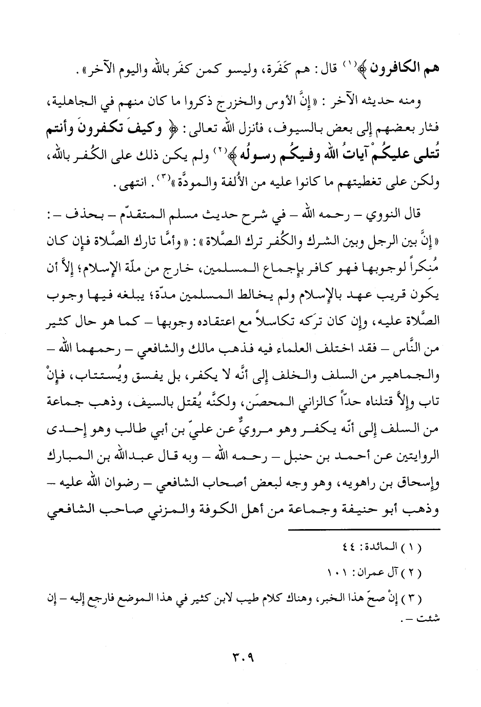 ومنه حديثه الآخر: "إِنَّ الأوس والخزرج ذكروا ما كان منهم في الجاهلية، فثار بعضهم إِلى بعض بالسيوف، فأنزل الله تعالى: {وكيفَ تكفرونَ وأنتم تُتلى عليكُمْ آياتُ الله وفيكُم رسولُه} (¬2) ولم يكن ذلك على الكُفر بالله، ولكن على تغطيتهم ما كانوا عليه من الأُلفة والمودَّة" (¬3). انتهى.
