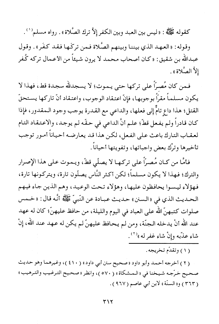 وقوله: "العهد الذي بيننا وبينهم الصَّلاة فمن تركَها فقد كفَر". وقول عبد الله بن شقيق: "كان أصحاب محمد لا يرون شيئاً من الأعمال تركه كُفر إلاَّ الصَّلاة".
