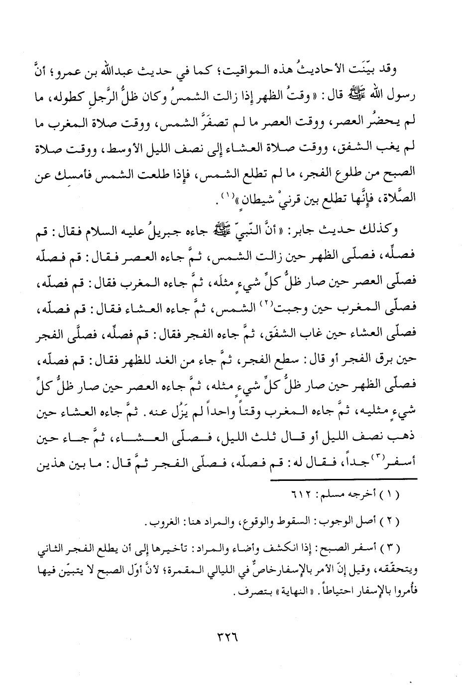 (¬3) أسفر الصبح: إِذا انكشف وأضاء والمراد: تأخيرها إِلى أن يطلع الفجر الثاني ويتحقّقه، وقيل إِن الأمر بالإِسفار خاصٌّ في الليالي المقمرة؛ لأنَّ أول الصبح لا يتبيّن فيها فأُمروا بالإِسفار احتياطاً. "النهاية" بتصرف.
