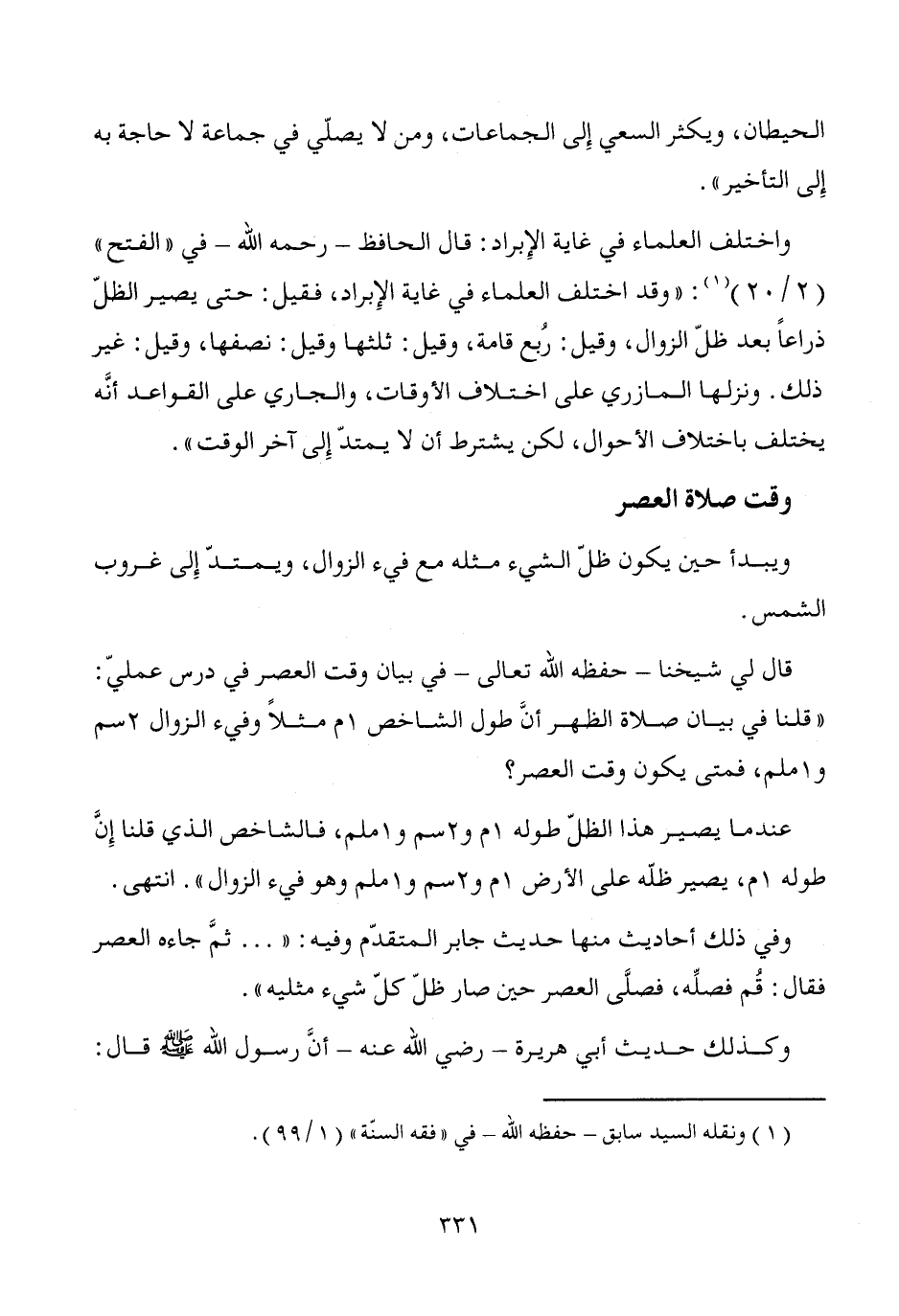 قال لي شيخنا -حفظه الله تعالى- في بيان وقت العصر في درس عمليّ: "قلنا في بيان صلاة الظهر أنَّ طول الشاخص 1م مثلاً وفيء الزوال 2سم و1 ملم، فمتى يكون وقت العصر؟