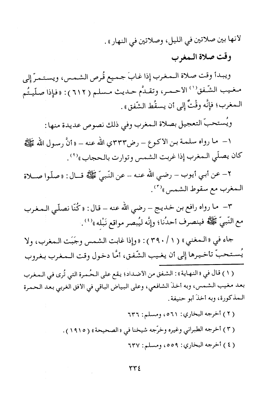 ويبدأ وقت صلاة المغرب إِذا غابَ جميع قُرص الشمس، ويستمرّ إِلى مغيب الشّفق (¬1) الأحمر، وتقدَّم حديث مسلم (612): "فإِذا صلّيتم المغرب؛ فإِنَّه وقْتٌ إِلى أن يسقُط الشّفق".