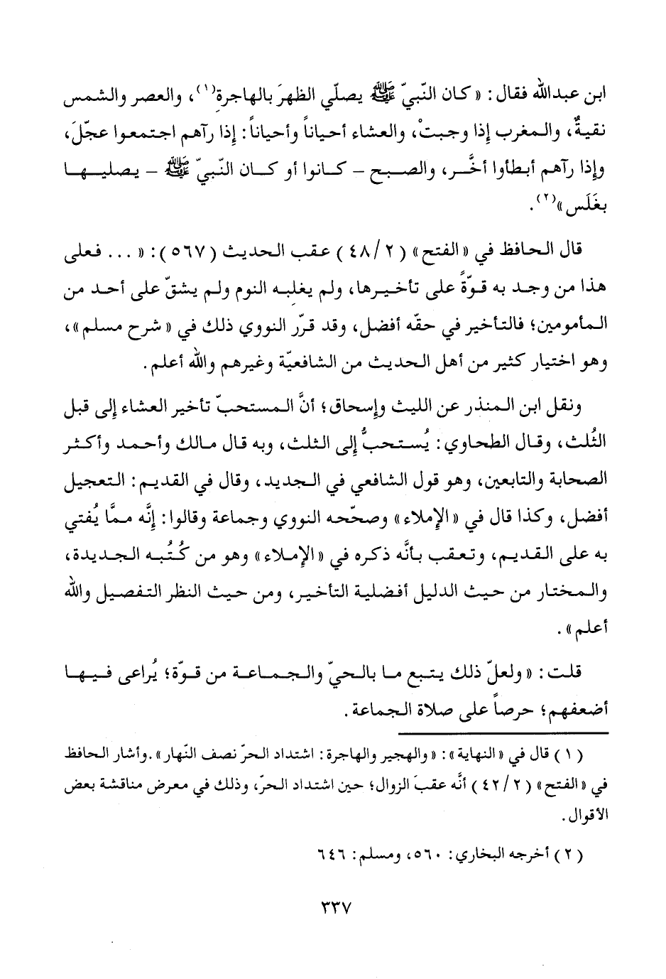 ونقل ابن المنذر عن الليث وإِسحاق؛ أنَّ المستحبّ تأخير العشاء إِلى قبل الثُلث، وقال الطحاوي: يُستحبُّ إِلى الثلث، وبه قال مالك وأحمد وأكثر الصحابة والتابعين، وهو قول الشافعي في الجديد، وقال في القديم: التعجيل أفضل، وكذا قال في "الإِملاء" وصحّحه النووي وجماعة وقالوا: إِنَّه ممَّا يُفتي به على القديم، وتعقب بأنَّه ذكره في "الإِملاء" وهو من كُتُبه الجديدة، والمختار من حيث الدليل أفضلية التأخير، ومن حيث النظر التفصيل والله أعلم".